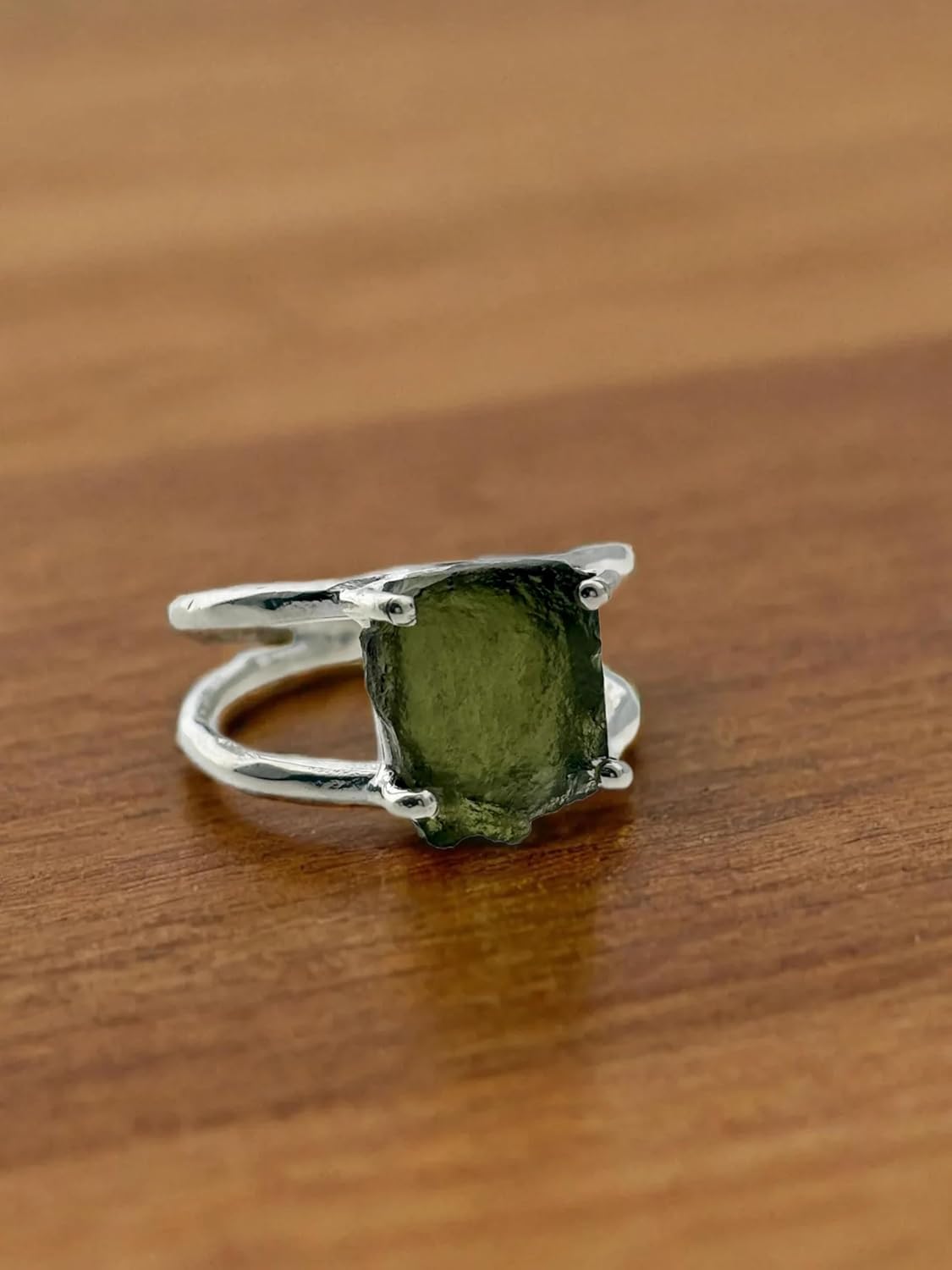 Elevate your spiritual style with this Rough Moldavite Silver Ring, handcrafted with love and precision in 925 Sterling Silver. Featuring a raw, uncut piece of certified Moldavite sourced from the Czech Republic, this striking statement ring is more than just a piece of jewelry—it’s a meaningful connection to the cosmos. Each Moldavite stone is carefully selected for its authenticity, energy, and raw beauty. Set in a sturdy, high-quality sterling silver band, the natural tektite crystal retains its rough texture, enhancing its metaphysical appeal. Believed to be formed from a meteorite impact over 15 million years ago, Moldavite is treasured for its powerful transformational and healing properties. Whether you’re a gemstone enthusiast, a spiritual seeker, or simply someone who appreciates rare and unique jewelry, this ring makes an unforgettable gift for her—perfect for birthdays, anniversaries, or spiritual milestones.