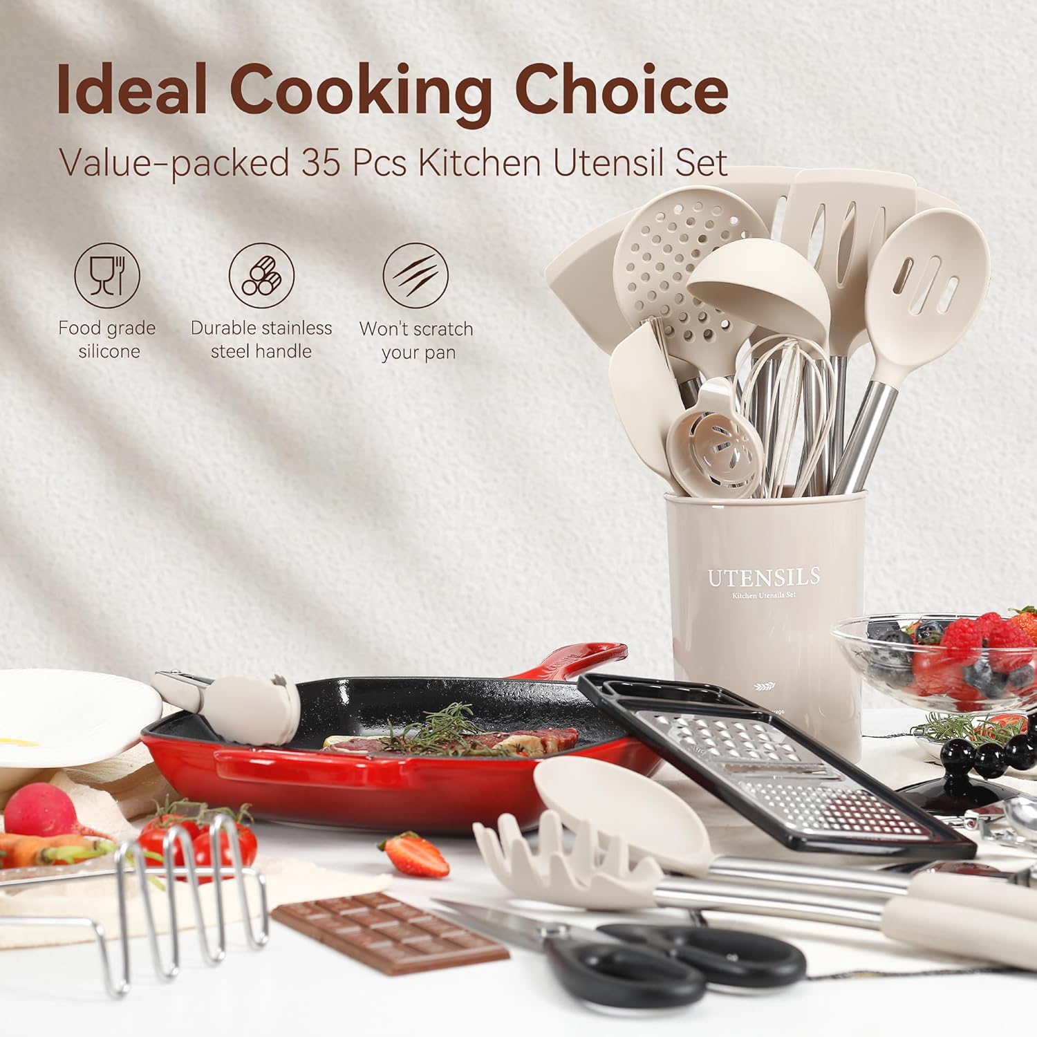 35-PIECE KITCHEN UTENSIL SET: This utensil set includes all the utensils you need to cook the perfect dish, so you don’t have to spend a fortune buying each utensil separately. Includes slotted spoons, spatulas, ladles, basting spatulas, oven mitts, mashers, kitchen tongs, scissors, ice cream scoops, pizza cutters and more. If you’re just starting out with your own home or want to get rid of worn out cooking utensils, we offer a full line of premium kitchen essentials for your new home