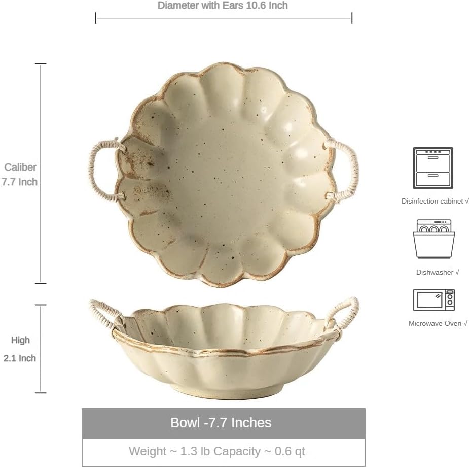 Featuring an elegant fluted edge and rustic rope handles, this petal-shaped ceramic serving bowl combines decoration with functionality. Perfect for salads, fruits, or as a table centerpiece, it adds a retro charm to any dining setting. Made of durable ceramic, it is dishwasher- and microwave-safe, ideal for both everyday use and special occasions..