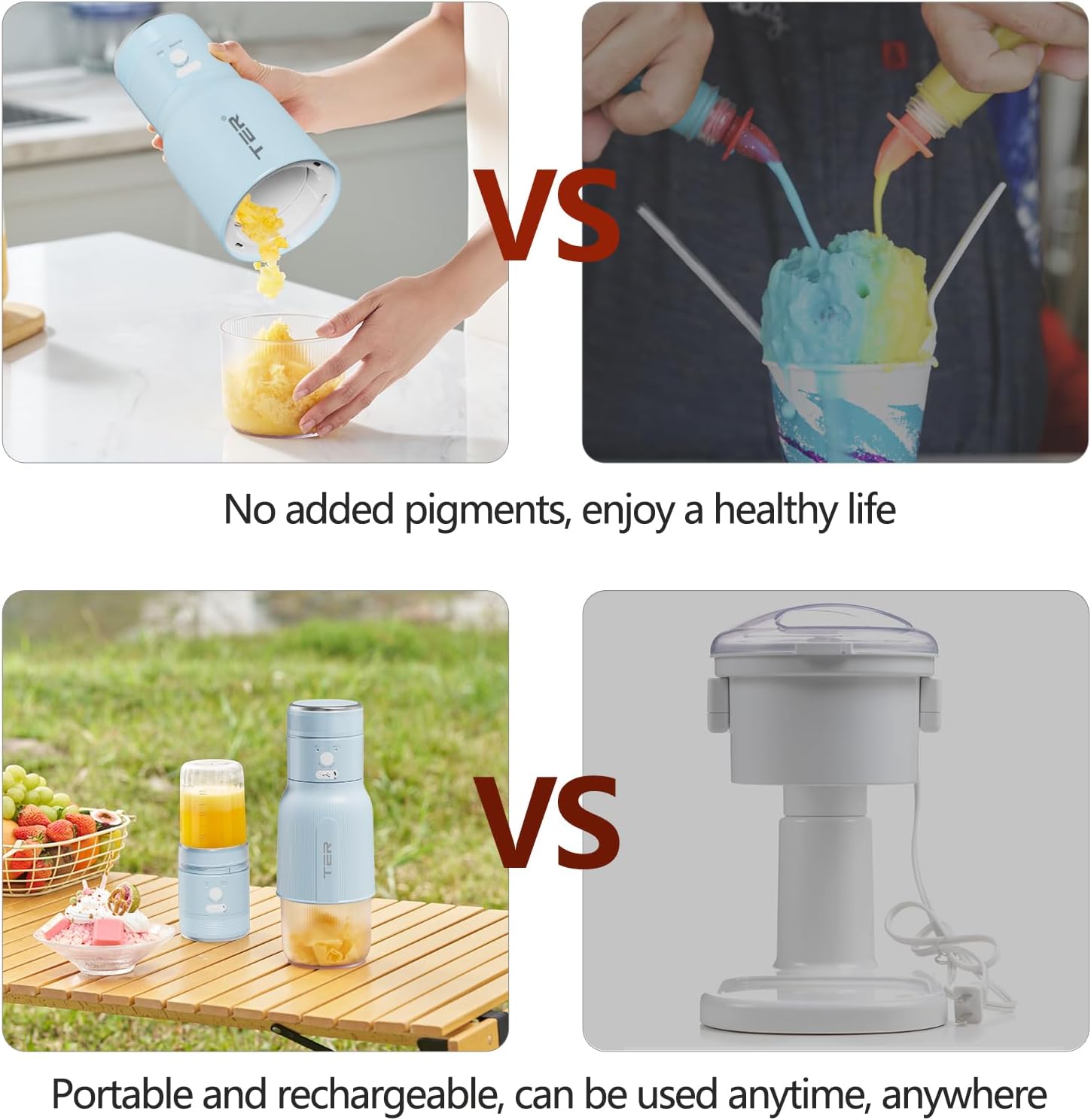 【Year-Round 2-in-1】Use as a personal portable blender for juice, smoothies and protein shakes; swap the head to make fluffy shaved ice for slushies and desserts. Works best with frozen juice.