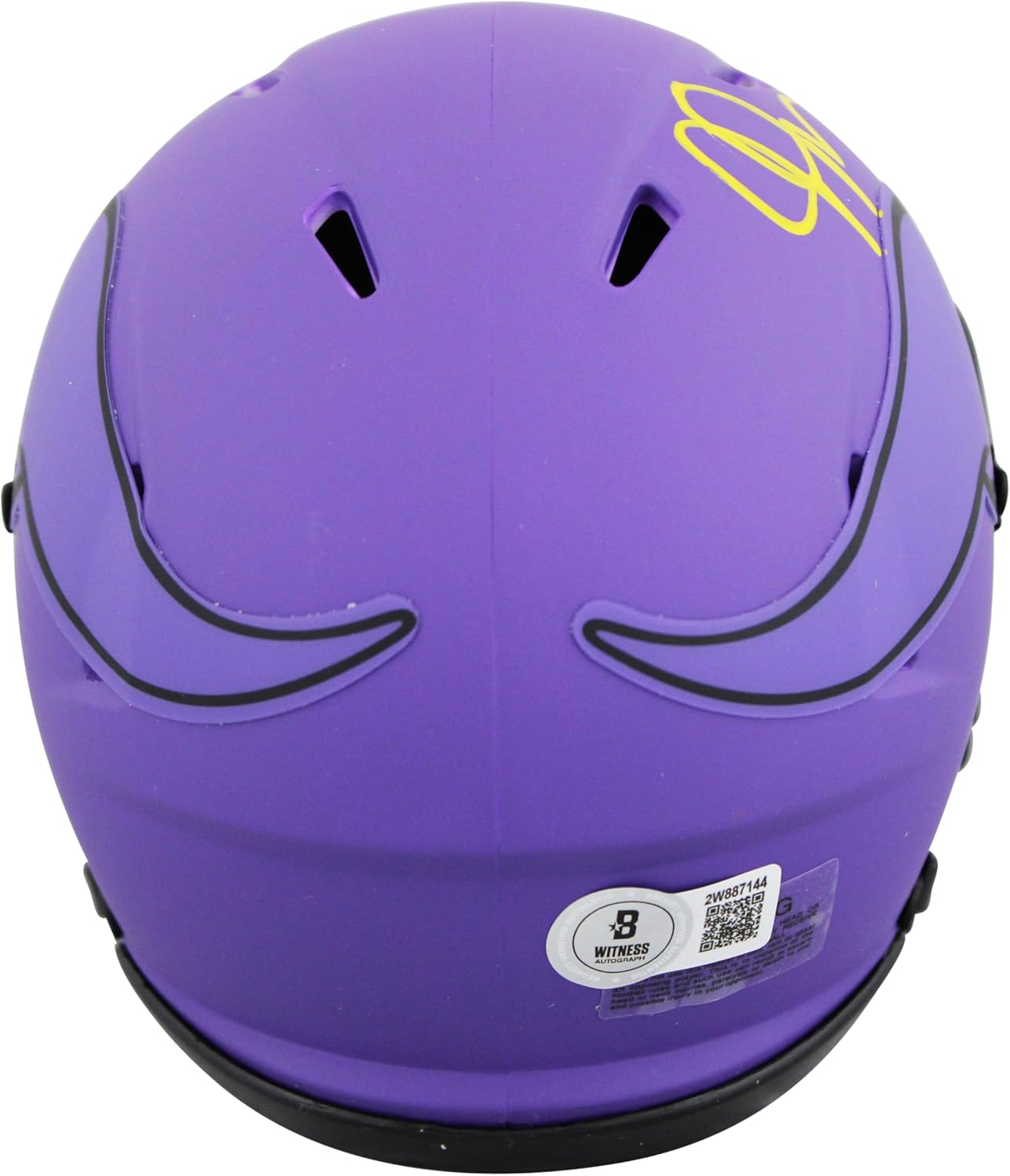This Autographed Alternate Rave Speed Mini Helmet has been Personally Signed by Justin Jefferson of the Minnesota Vikings. This item is 100% Authentic to include a hologram by Beckett Authentication Services. This item will come with an affixed Beckett Authentication Services (BAS) authentication sticker, which includes a scannable QR code to verify authenticity. Please note that Beckett no longer provides serial-numbered COA cards, and the attached BAS sticker will serve as the complete authentication for this item. This is a BAS Witnessed Protection Program item which means a Beckett Authentication Service representative was present when this item was being signed. We conducted an autograph signing with Justin Jefferson where multiples of the same item were signed. While the photographs are representative of this item, the size, placement and strength of the signature may vary. Each item is hand signed, therefore, each autograph is unique. This item can be verified through BAS Witnessed.