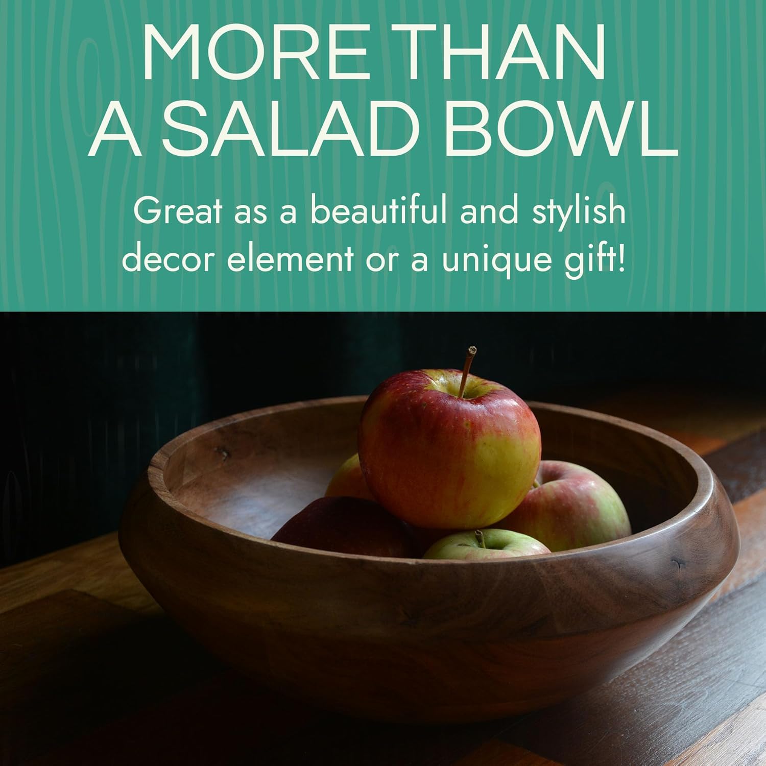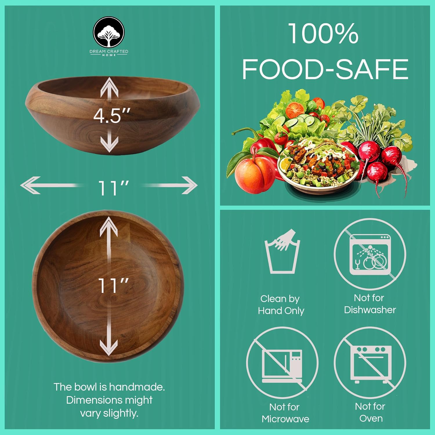 HANDCRAFTED ARTISANAL DESIGN: Our wooden bowl set features a large 11-inch acacia bowl and two acacia servers (spoon and fork), perfect for serving salad, fruit, holding your keys, or as a decorative piece on your kitchen table. Each piece, a testament to craftsmanship, ensuring a unique and elegant design that adds a touch of nature’s artistry to your home.