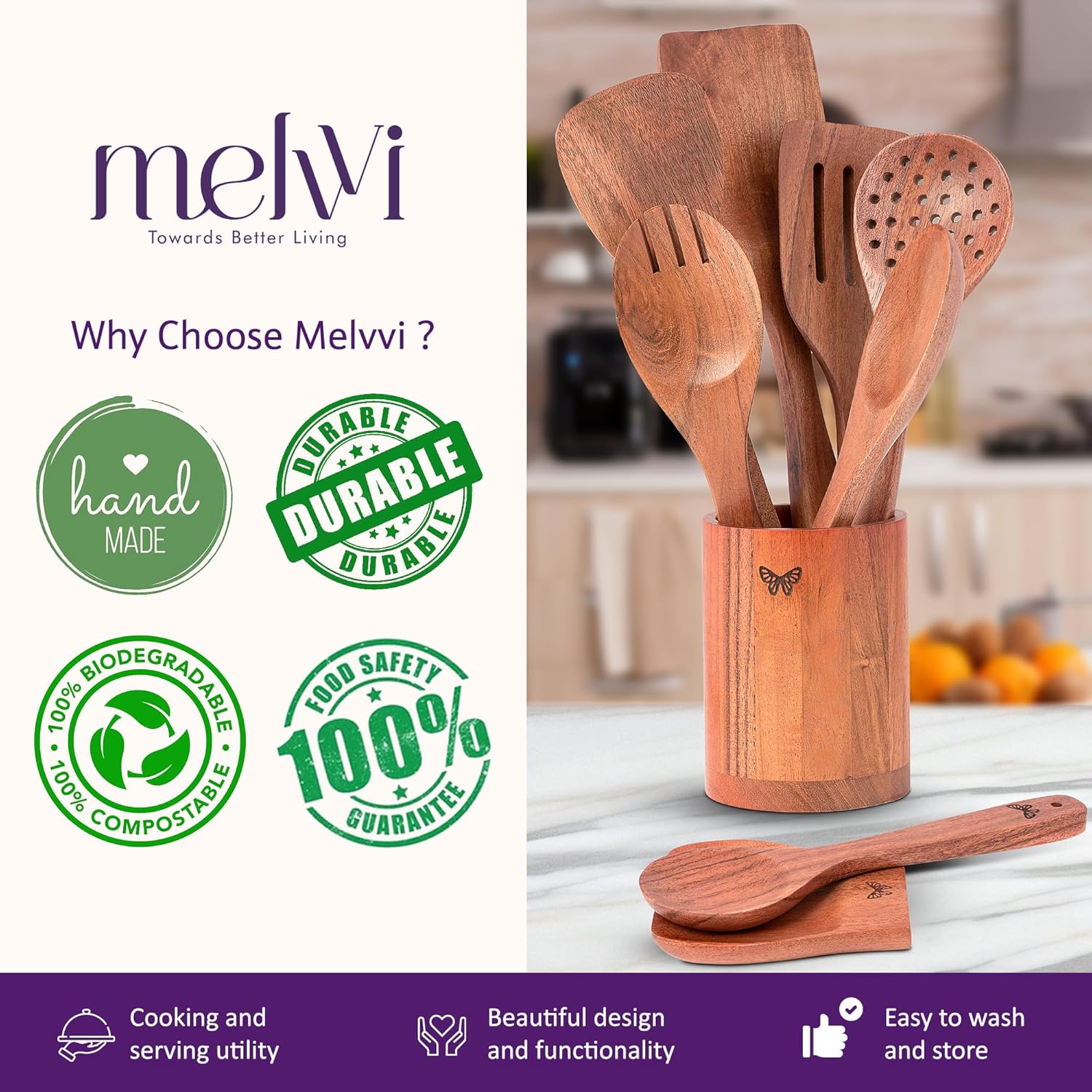 HIGH QUALITY ACACIA WOOD: This Wooden Utensil set is made up of 100% natural premium Acacia wood making it durable, resistant to wear & tear and sustainable. This spoon set will not crack, melt or smell. The utensils may vary in shade due to its natural material.