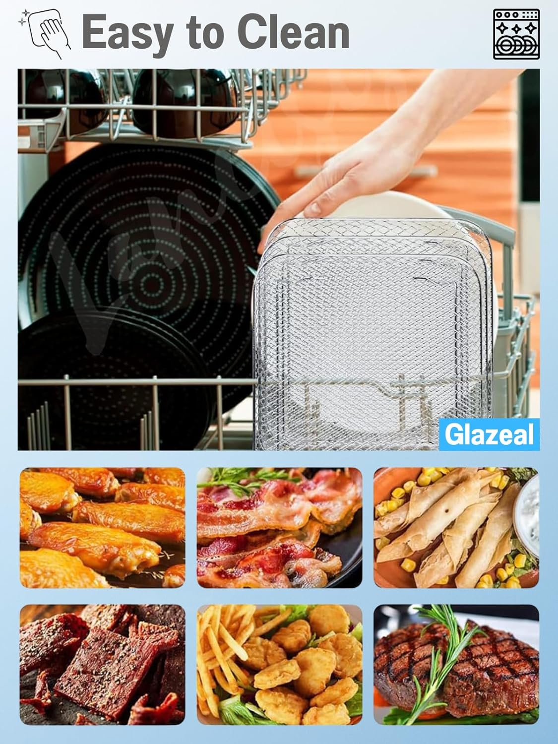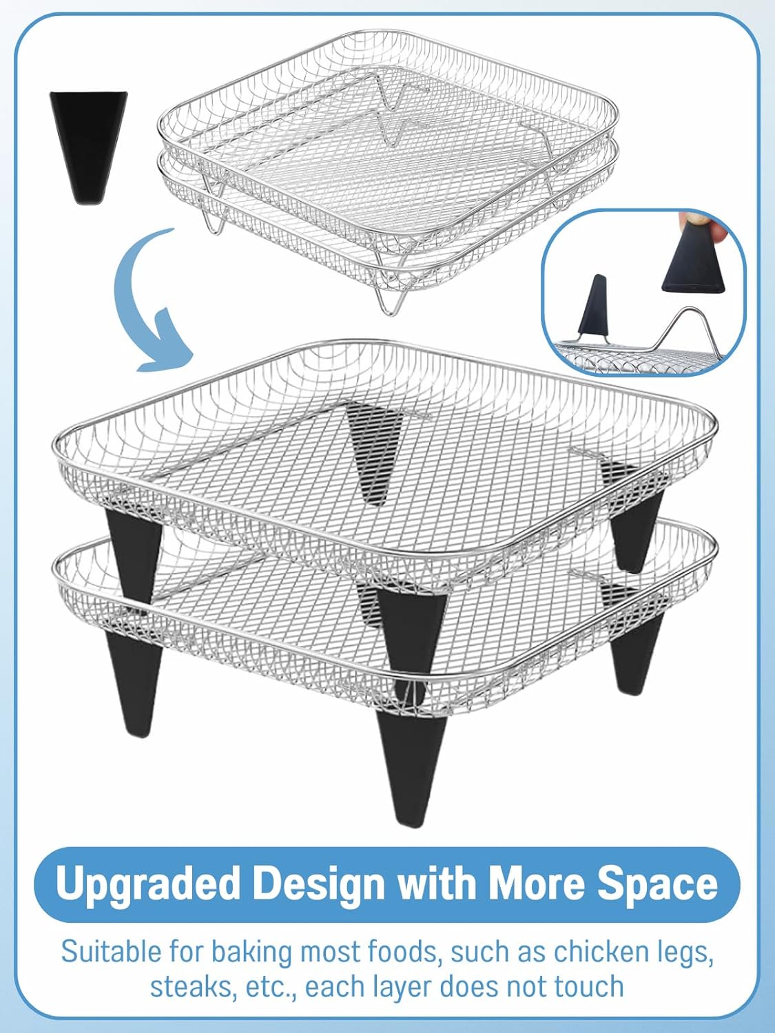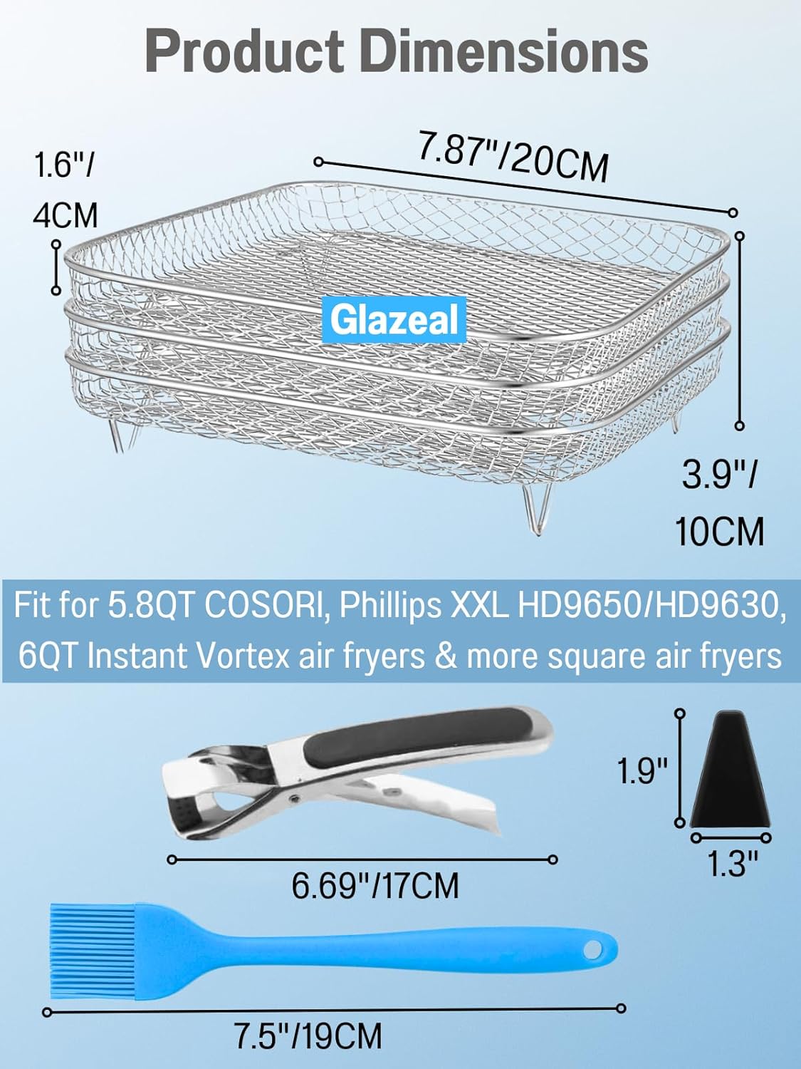 3-Layer Stackable Dehydrator Square Rack Set Fits 4.2-5.8 QT Air Fryer, Stainless Steel 304 Air Fryer Accessories with 8pcs Silicone Feet, Oil Brush & Food Clip