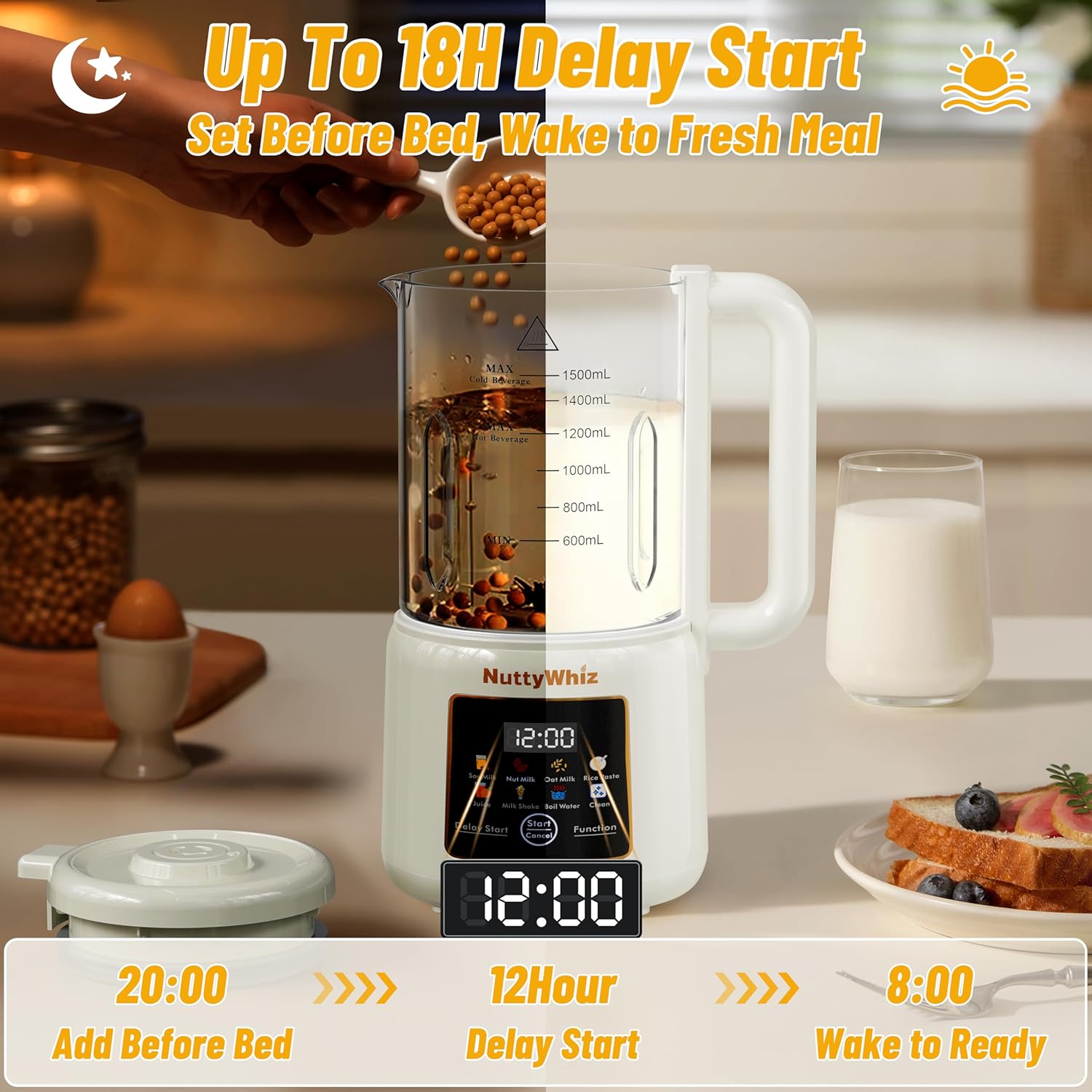 【Easy & Convenient】With the NuttyWhiz Automatic Nut Milk Maker, you can skip the soaking step, making the process of creating wholesome vegan soy milk simpler than ever. Plus, it features boiling water, keep-warm (4 hours), delay start (18 hours), and self-cleaning functions—all designed for effortless plant-based milk prep.