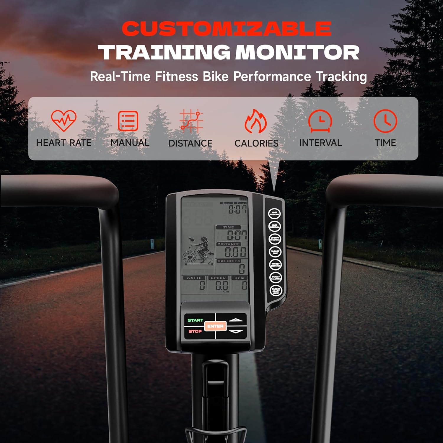 【Customizable LCD Monitor】Our premium air bike comes with an upgraded display that accurately tracks time, speed, distance, calories, and heart rate in real-time for professional performance analytics. Instant feedback helps optimize training intensity for maximum results