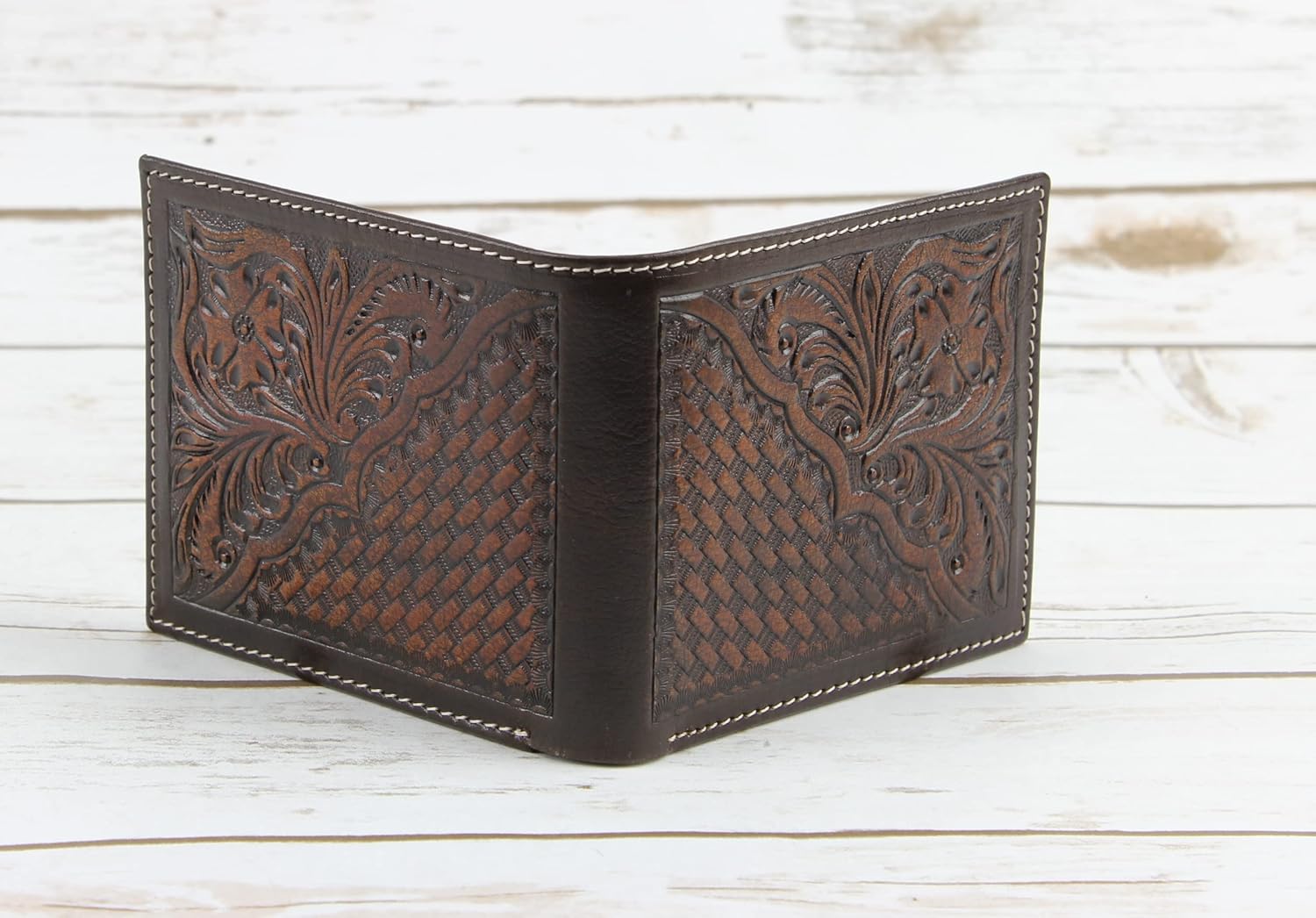 American Bison RFID Safe Cowhide Tooled Leather Bifold Men’s Wallet. Crafted from premium cowhide leather with a tooled floral design, this wallet offers style, security, and functionality.