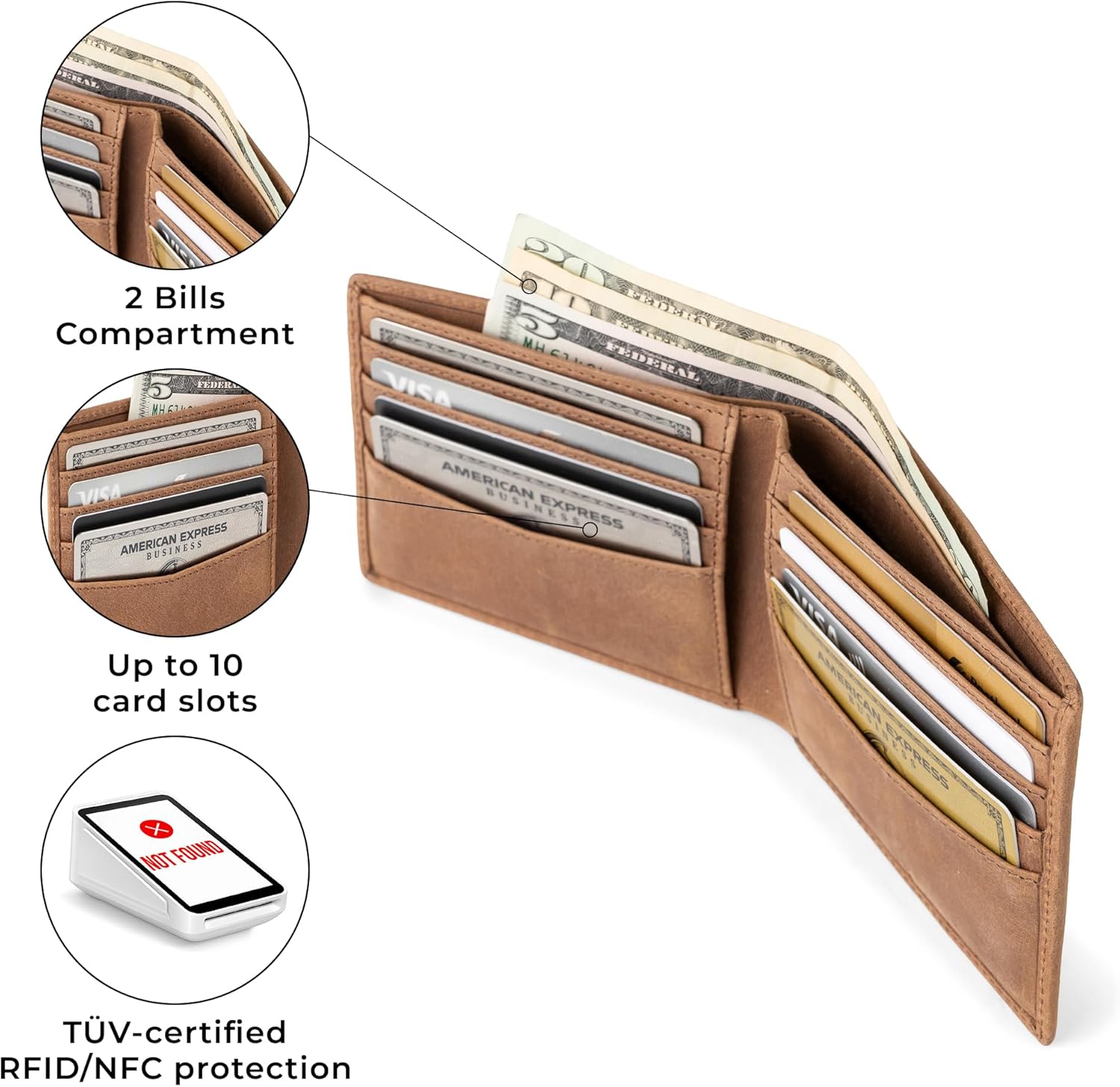 BERLINER BAGS Vintage Genuine Leather Wallet for Men Brooklyn, RFID Blocking, Bifold, Front Pocket Slim Wallet, 10 Card Holder, 2 Bills Compartment, 1 Gift Box – Brown