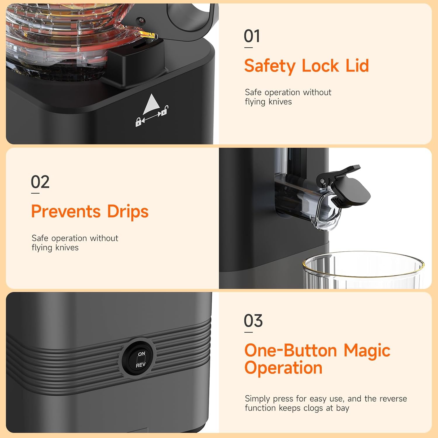 One-Button Operation & Safety Design: It is operated with a simple rotation of the button, making it effortless for you to enjoy fresh juice. Moreover, the reverse function is integrated to prevent clogging effectively. For added safety, especially for children, the juice maker (a reliable juicer machine) will automatically shut down if the cover is accidentally opened during the juicing process.