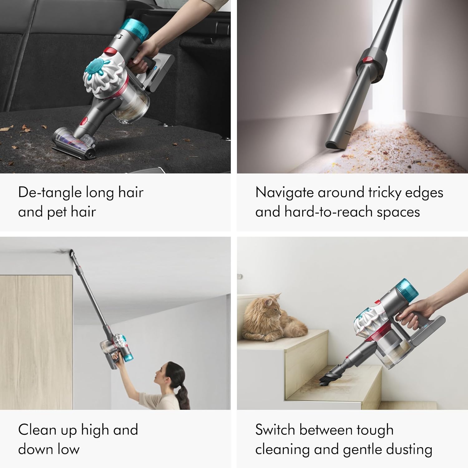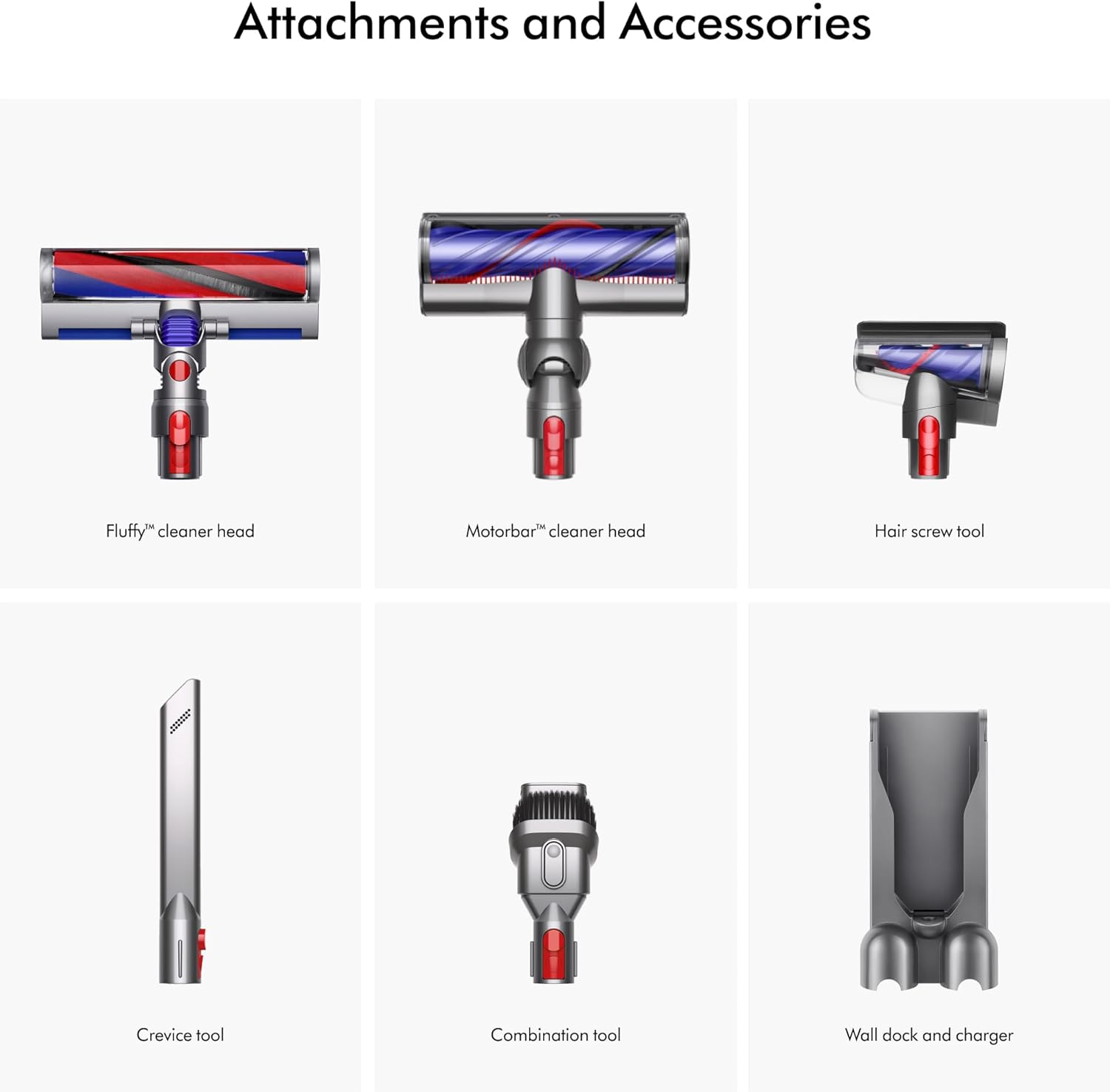 The Dyson V8 Absolute cordless vacuum is engineered with the power, versatility, tools, and run time to clean homes with pets. Dyson’s de-tangling Motorbar™ cleaner head deep cleans carpets and hard floors. With hair removal vanes that clear long hair and pet hair from the brush bar as you clean. Dyson’s Fluffy™ cleaner head is engineered with soft waven nylon and anti-static carbon fiber, for hard floors. The Dyson V8 Absolute has fully sealed HEPA filtration that captures fine dust and expels cleaner air. Thanks to the cordless format, it also transforms into a handheld vacuum with one click so you can clean up high, down low, and everywhere in between. Comes with a 6 month warranty and lifetime Dyson support. Register your machine on the MyDyson™ app for personalized machine guides, maintenance and support.