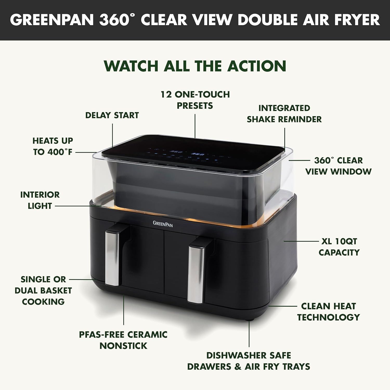 Cook double the meals, save time, and get more done with this dual basket air fryer! Featuring two 5QT baskets, you can cook one dish or use both to prepare two meals at once. The 360˚ Clear View Window and handy interior light lets you keep an eye on both dishes and know exactly when they’re ready. GreenPan’s Clean Heat technology fries without oil, while the PFAS-free nonstick interior ensures healthier meals. With convenient functions like the integrated shake reminder, delay start, and optional preheat, you’ll get optimal results every time. After cooking, simply wipe down the baskets or place them in the dishwasher for easy cleanup.