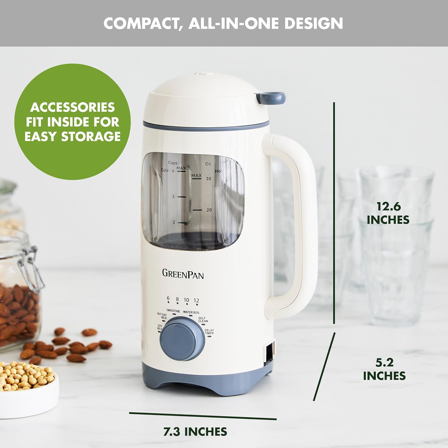 The GreenPan Better Blend Milk Maker lets you craft fresh, plant-based milk right at home in minutes: almond, oat, cashew, walnut, pistachio, coconut, macadamia, rice, and soy. Plus, this versatile machine is perfect for smoothies, soups, sauces, dips, baby food, and even boiling water. The powerful motor ensures fast, flawless blending, while the easy-view window lets you watch every step. Make up to 30 oz for the whole family, then store it compactly without taking up space. Cleanup is effortless with the simple Self-Clean function, and the BPA-free design allows for healthier creations every time. Thoughtful features like a magnetic lid detection and delay timer make things easier while the strainer, cleaning brush, and detachable cord are included for added convenience.