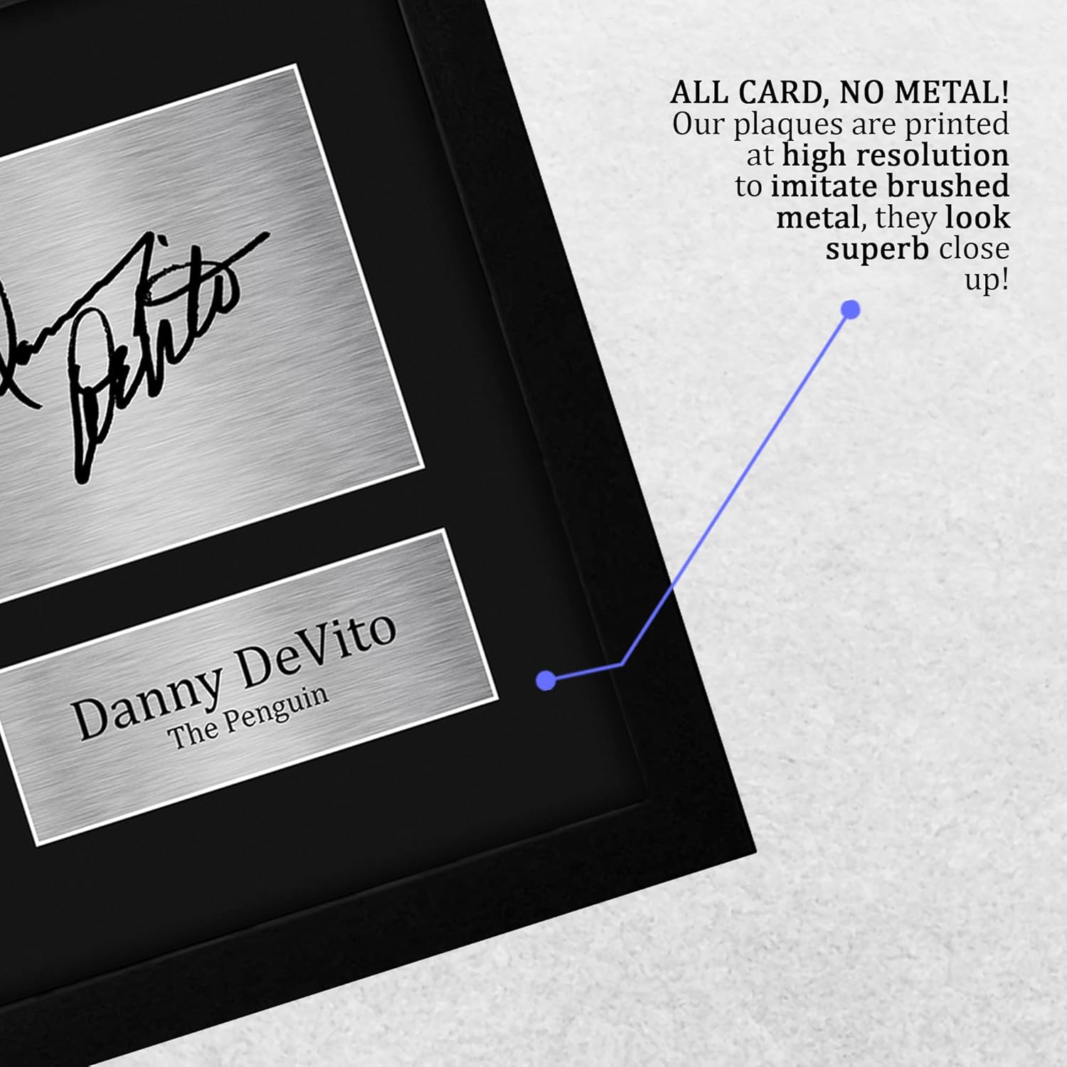 Professionally made in our studio, this framed Danny DeVito Batman The Penguin Oswald Cobblepot display comes with a high-quality picture alongside printed copies of their famous autograph signature. Mounted in a matt black using an acid-free display board, it’s perfectly finished with an autographed name in a silver, mock printed plaque. This print comes framed in a sleek black polycarbonate frame that compliments the matt mount display. Lightweight, but of the highest quality, these make the ideal Christmas/Birthday gift for fans of all ages, and best of all, it definitely won’t break the bank!