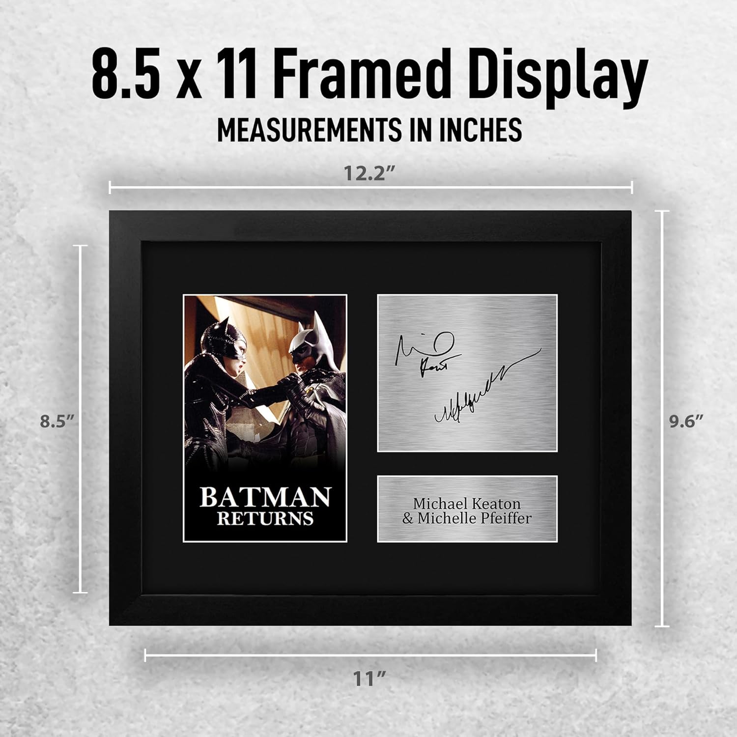 Professionally made in our studio, this Framed Michael Keaton & Michelle Pfeiffer display makes for an ideal gift idea. This laser printed quality photograph is mounted in a precision cut three windowed acid-free matt black display board. To the left of the display there is the main image. To the right of the display there are two metallic effect plaque areas for printed copies of the name and autograph signature. This display comes ready framed in a sleek black polycarbonate frame that compliments the matt mount display and a clear perspex front to keep it dust free and clean. Lightweight, but of the highest quality, these make the ideal Christmas/Birthday gift for fans of all ages, and best of all, it definitely won’t break the bank!