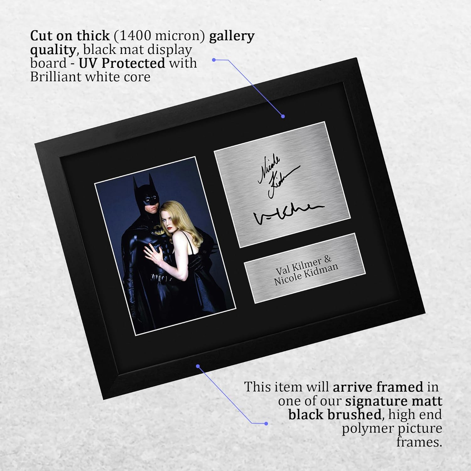 Professionally made in our studio, this Framed Val Kilmer & Nicole Kidman display makes for an ideal gift idea. This laser printed quality photograph is mounted in a precision cut three windowed acid-free matt black display board. To the left of the display there is the main image. To the right of the display there are two metallic effect plaque areas for printed copies of the name and autograph signature. This display comes ready framed in a sleek black polycarbonate frame that compliments the matt mount display and a clear perspex front to keep it dust free and clean. Lightweight, but of the highest quality, these make the ideal Christmas/Birthday gift for fans of all ages, and best of all, it definitely won’t break the bank!