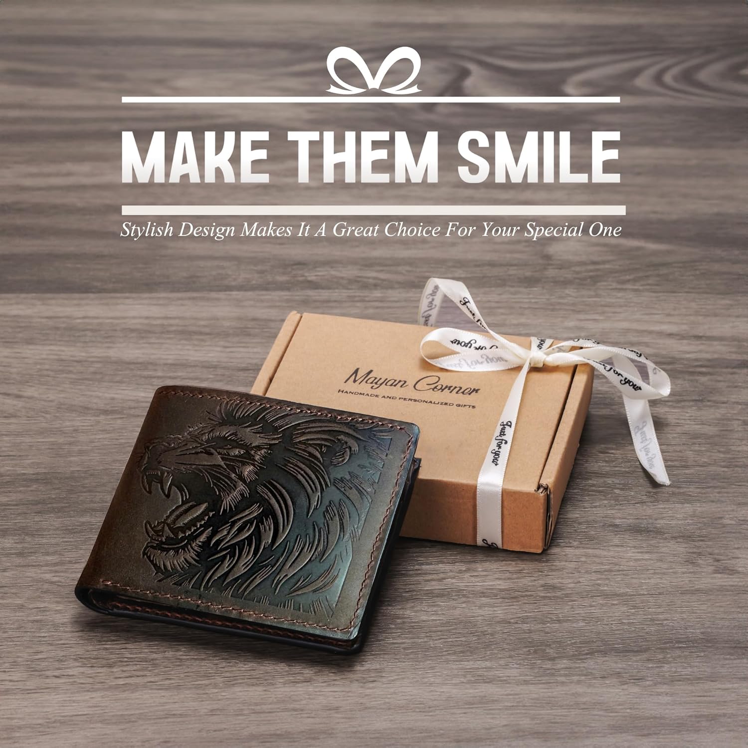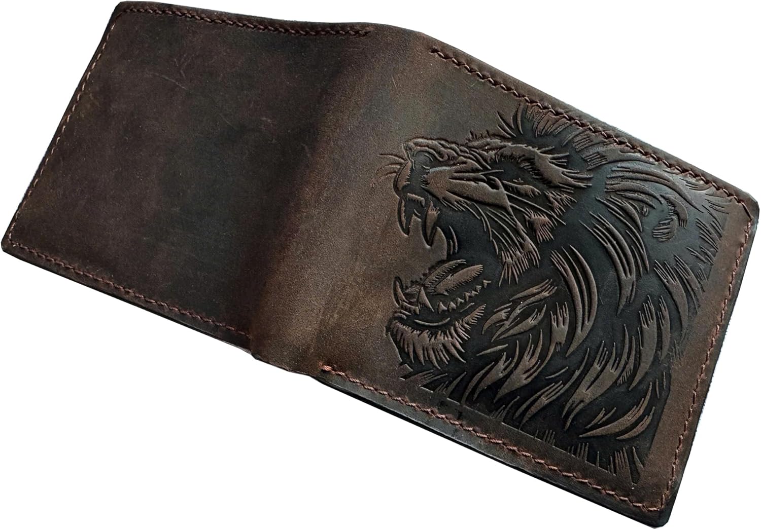 HANDCRAFTED DESIGN: Genuine leather wallet featuring an intricately embossed roaring lion head design, showcasing detailed artisanal craftsmanship