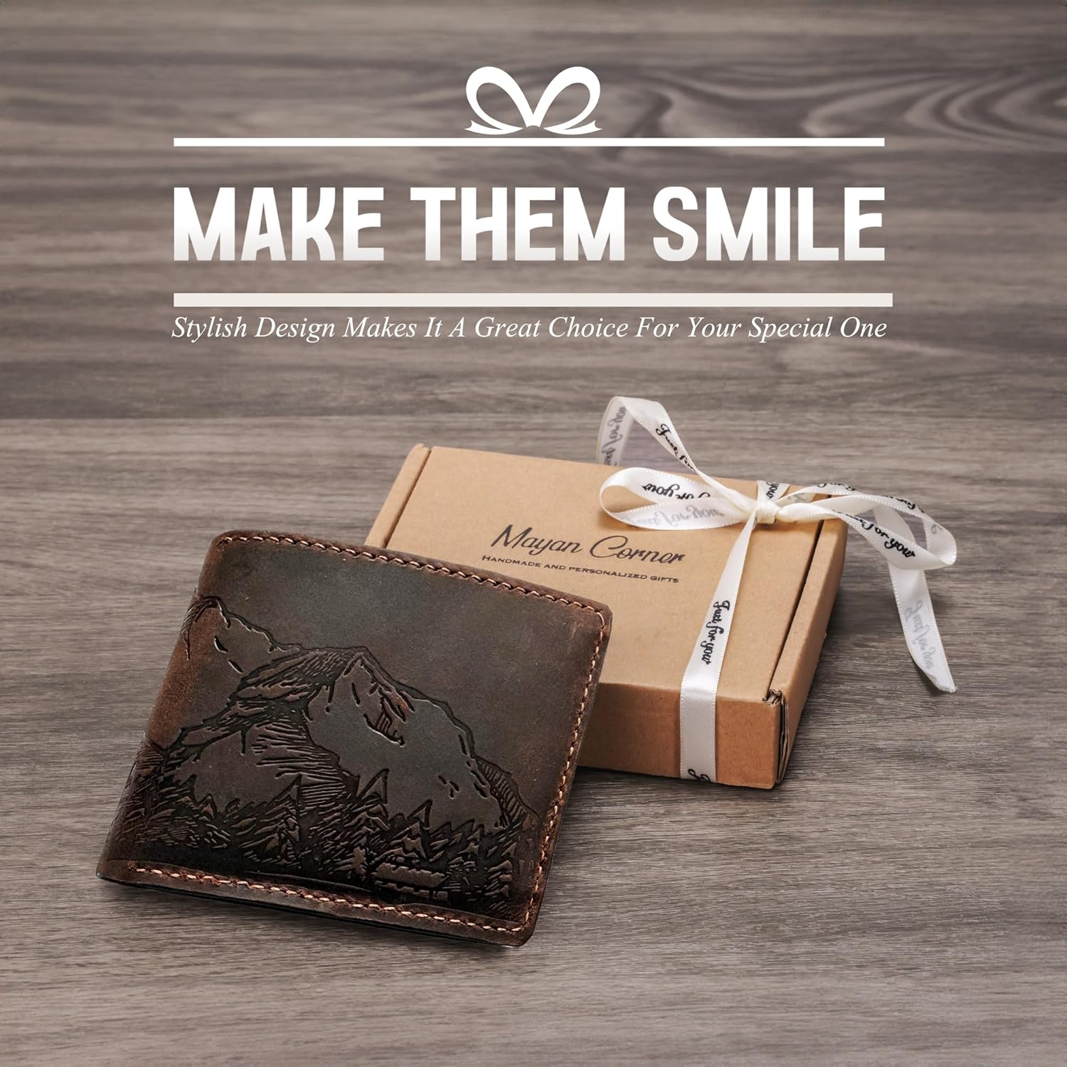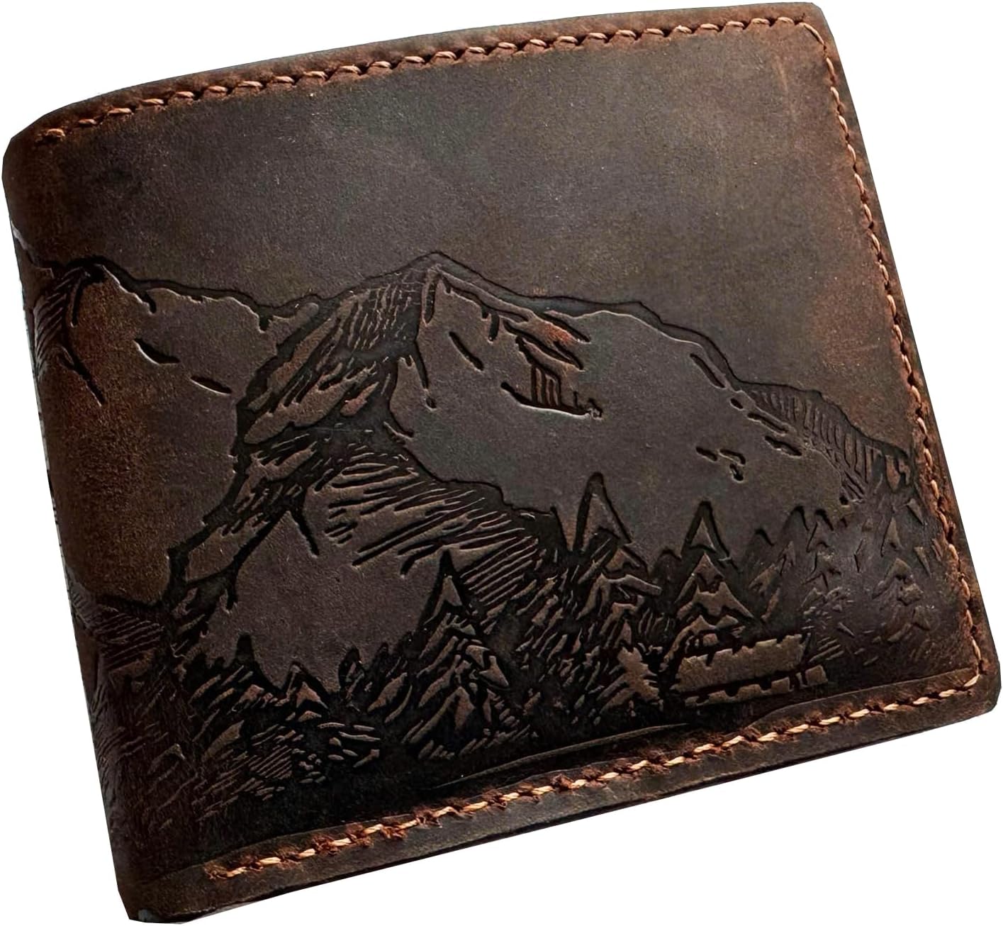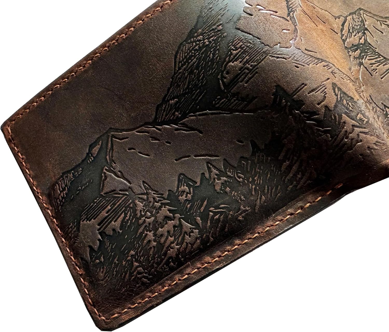 – Mountain genuine leather handmade men bifold wallet have 02 big folders for cash in horizontal, 02 medium folders for bill/driver license…04 card slots and 01 ID card folder