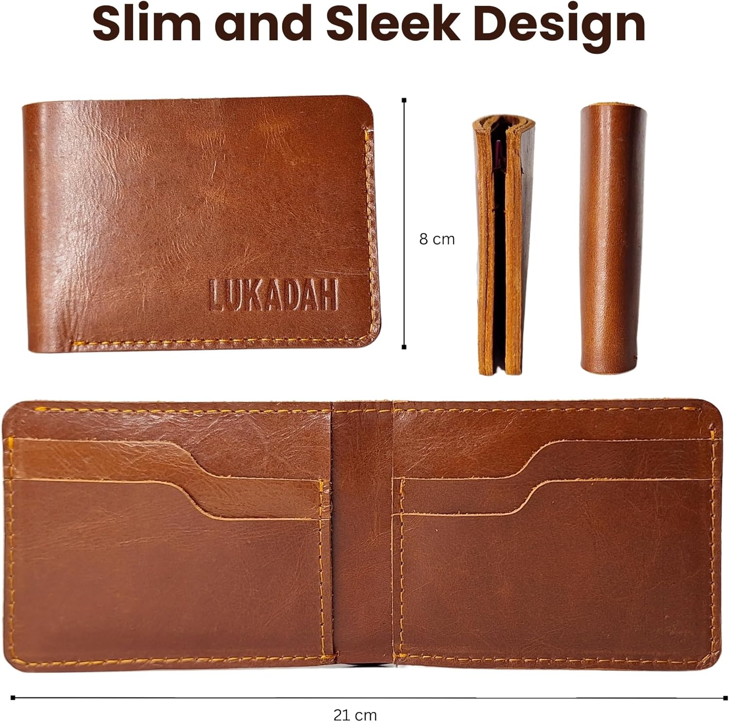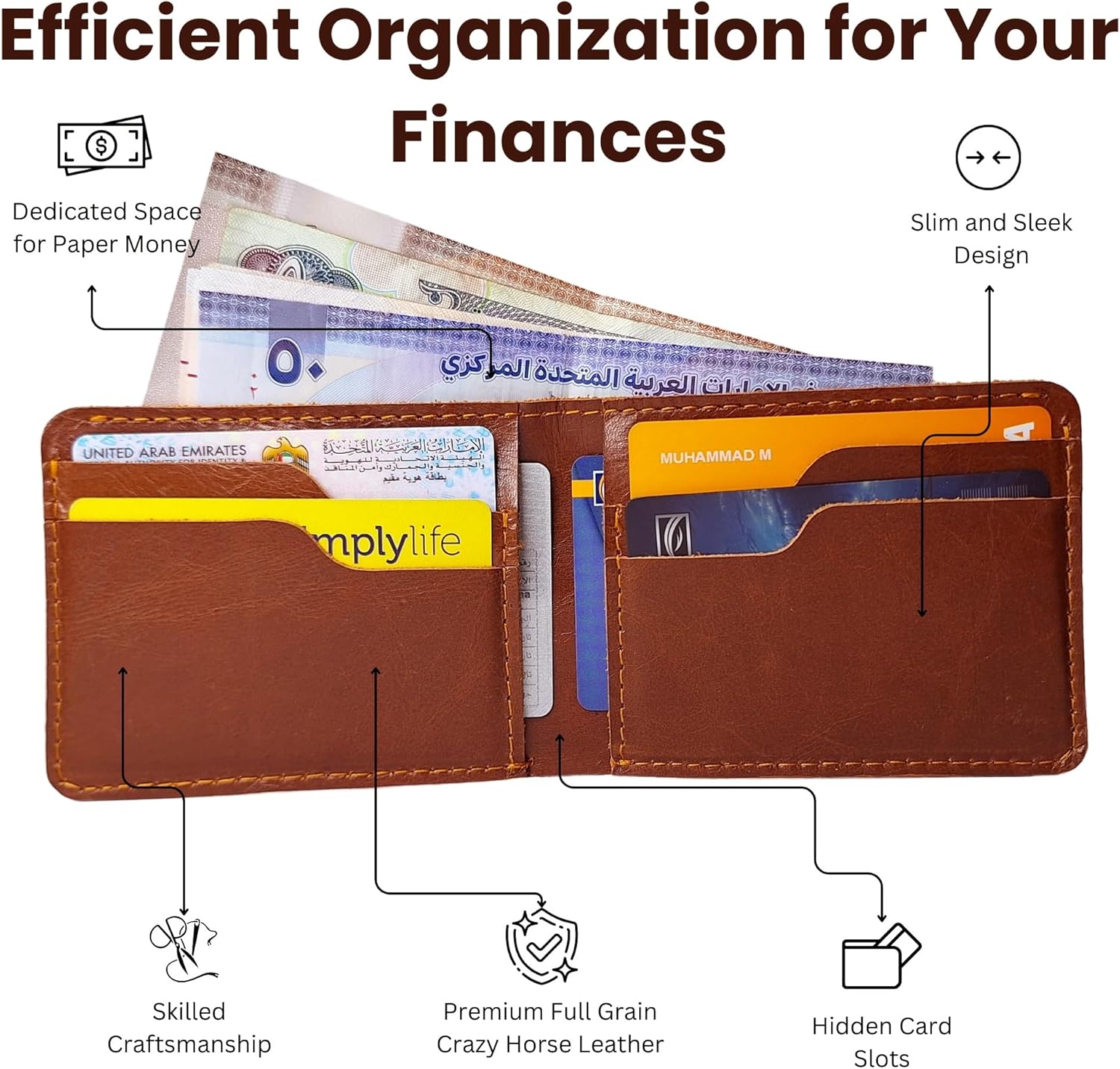 QUALITY THAT YOU CAN SEE & FEEL:Step up your accessory game with our Genuine Men’s Wallet. Made from genuine full-grain leather, this wallet is the epitome of style, quality, and functionality. The full-grain leather used in our wallets is the highest quality of leather available. It’s known for its strength, durability, and ability to age beautifully, giving your wallet a unique, vintage look over time.HANDCRAFTED MATERIAL:Handcrafted by skilled artisans, each wallet exudes individuality. The meticulous craftsmanship is apparent in every stitch, transforming this accessory into a unique work of art. Beyond practicality, it stands as a testament to the artistry behind its creation, elevating it to more than just a wallet but a true masterpiece.FEATURES THAT YOU WILL LOVE: Bifold Design Gift Box Packaging Ample Card Slots Cash Compartment Handcrafted Excellence Genuine Full Grain LeatherMODERN TRAVELER WALLET:Ideal for today’s traveler, this wallet’s compact size easily slips into your pocket for convenient portability. Despite its small footprint, it boasts a spacious interior, accommodating all your essentials and simplifying your travel experience. Embrace comfort and functionality on the go with this modern, travel-friendly wallet.GET A COOL WALLET:Invest in a wallet that combines style, quality, and functionality. Choose our Premium Men’s Wallet – Genuine Full Grain Leather – Handcrafted Bifold – Large Capacity