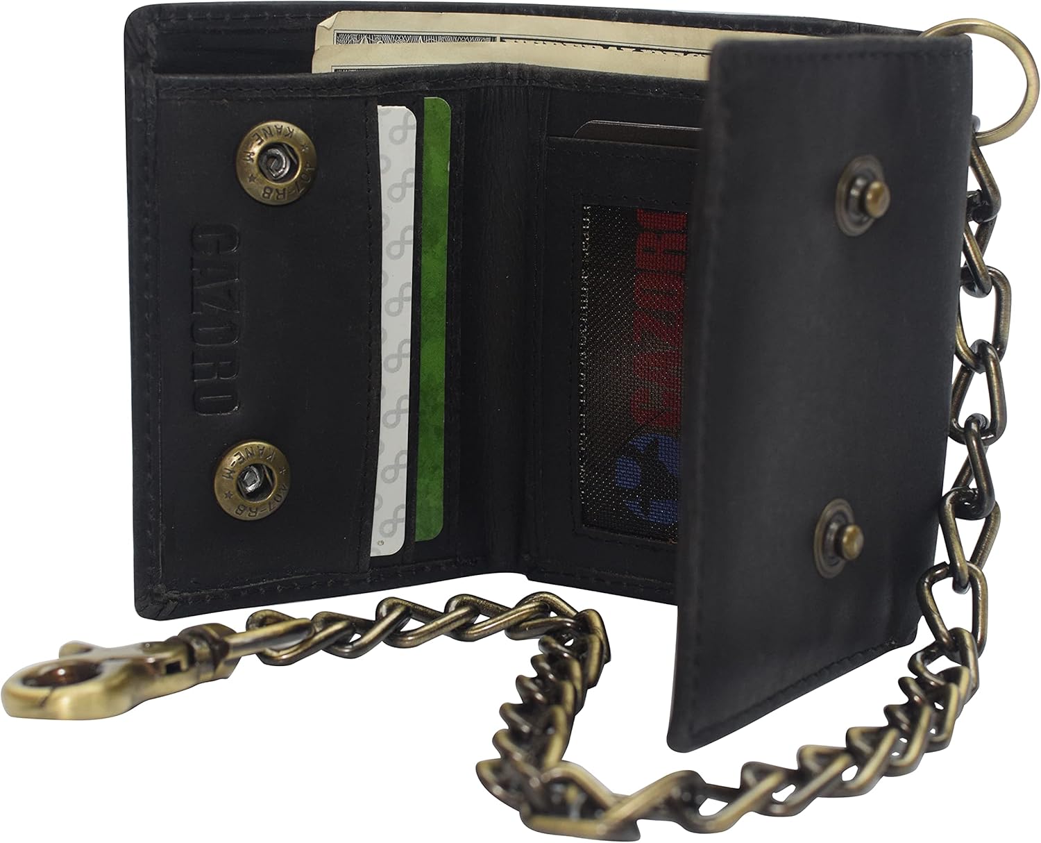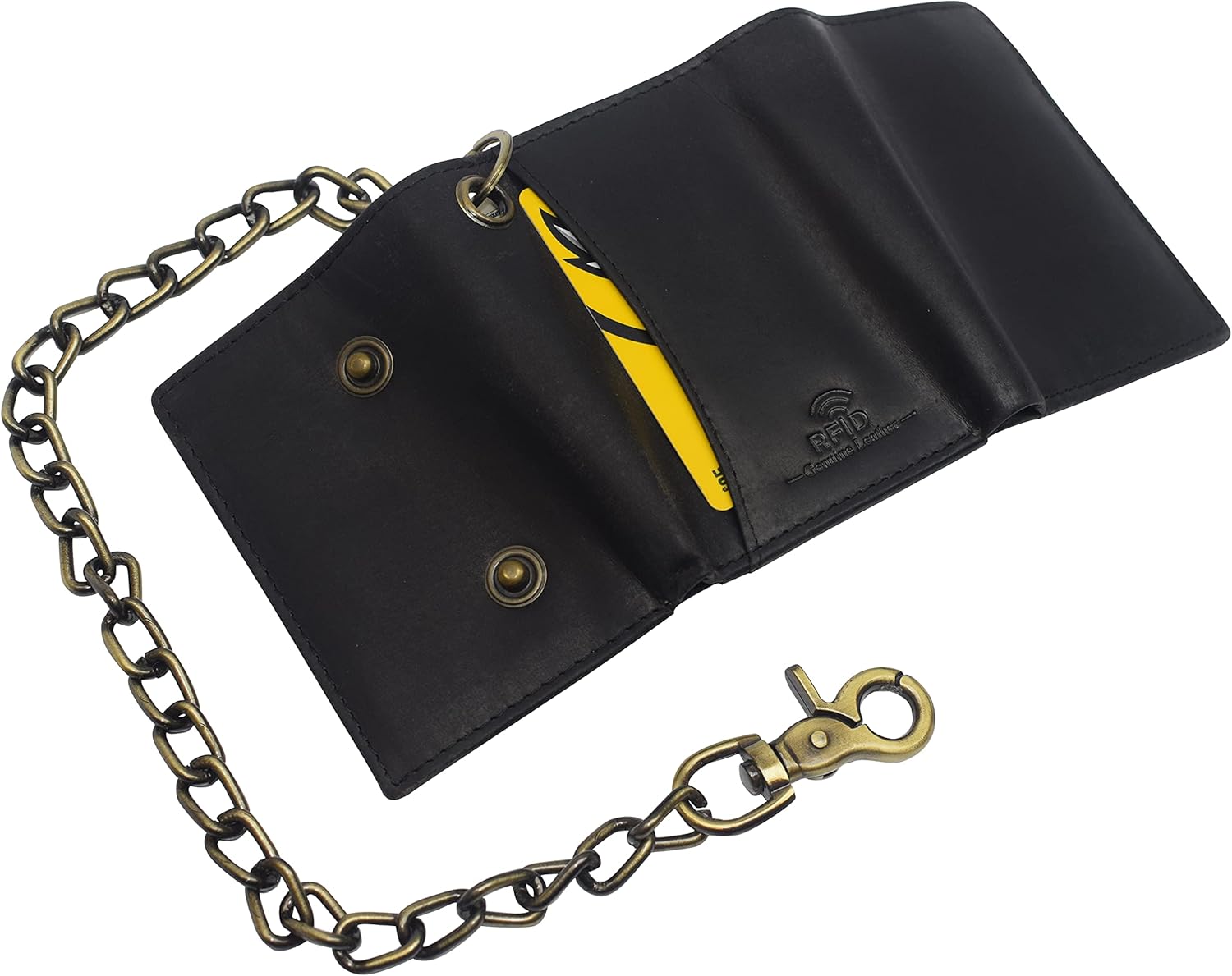 Elevate your style with the CAZORO Men’s RFID Blocking Trifold Wallet, featuring vintage leather, secure RFID blocking, and a trendy biker chain. The snap closure adds convenience, making it a stylish and functional accessory for the modern man.