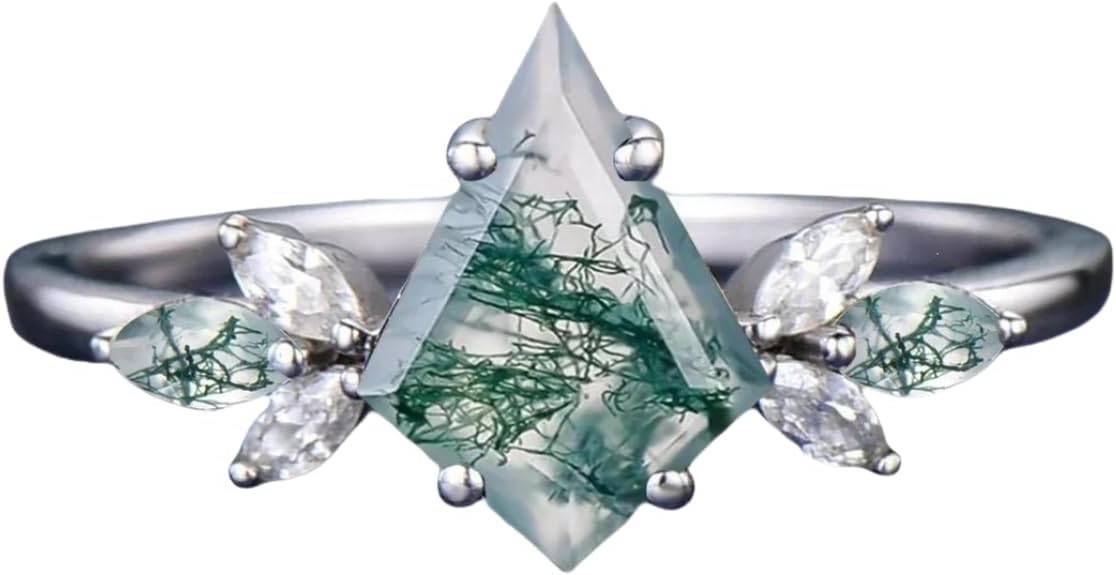 Center Stone: Natural Moss Agate Center Stone Size: 1 – 3 Carats Side Stones: Moissanite or Other Gemstones Material: 925 Sterling Silver, 10K/14K/18K Gold Color: White, Yellow and Rose Gold Size: 4-12 Customization: Provide Free Engraving Service