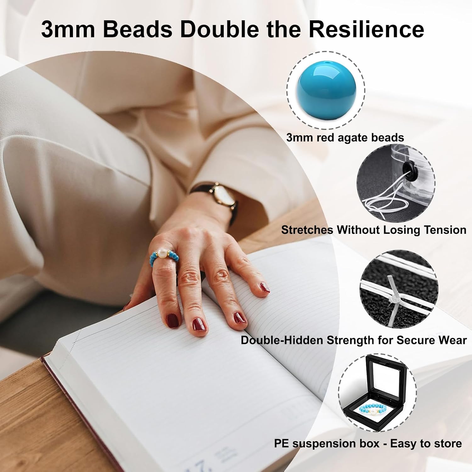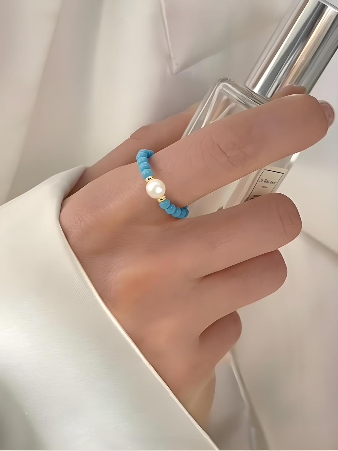 Natural Stone Bead Ring for Women – Adjustable Elastic Stretch Ring Stackable Boho Spiritual Jewelry Gift (Sizes 6-8)