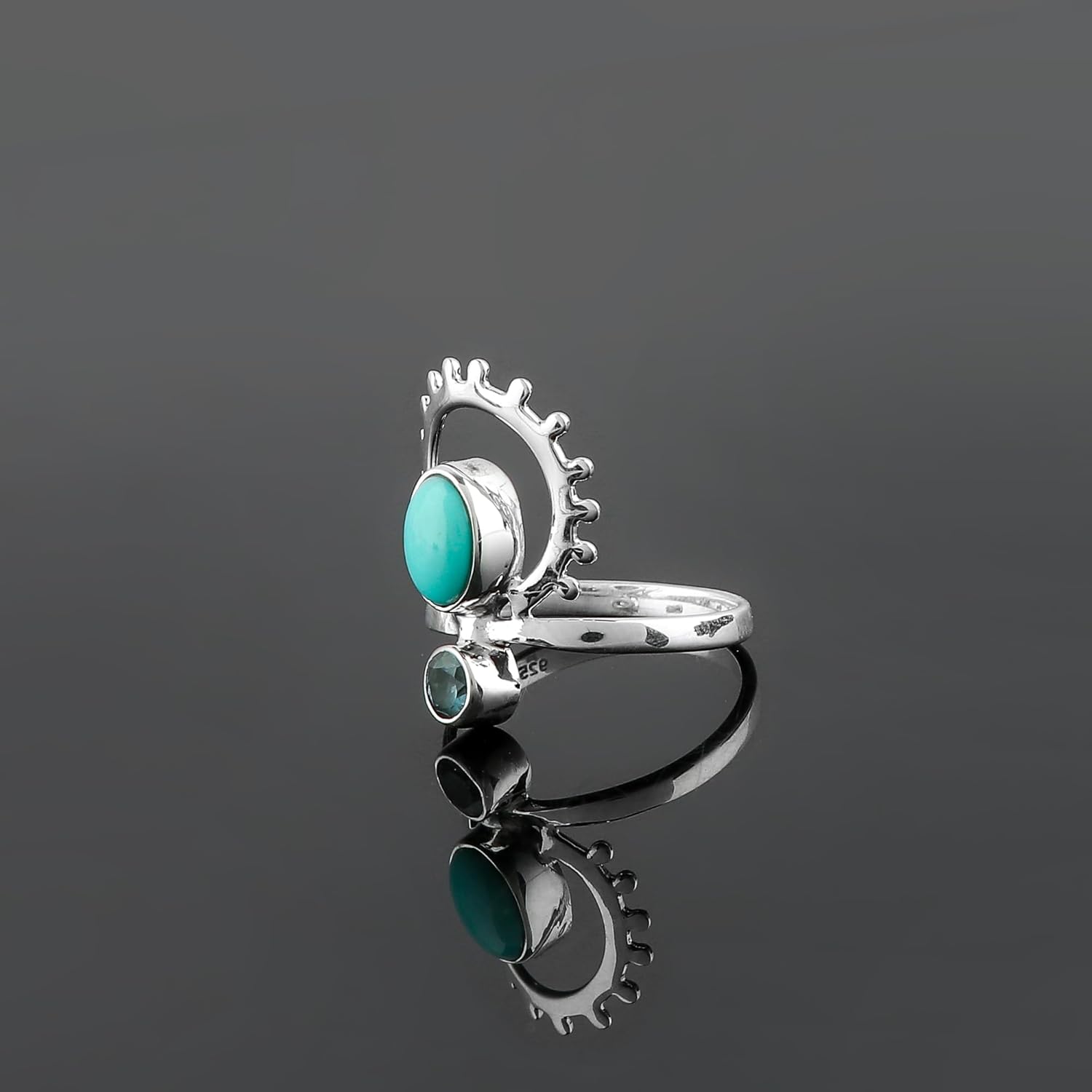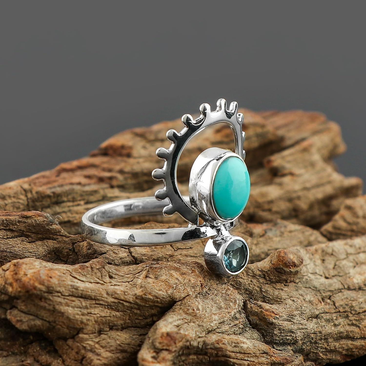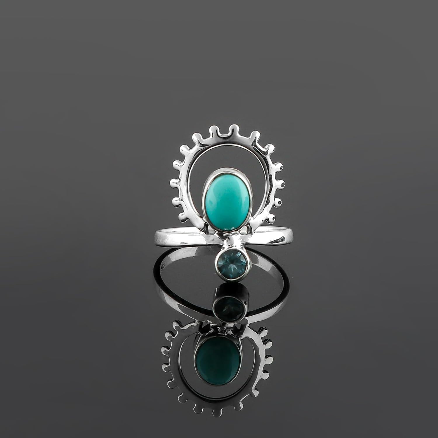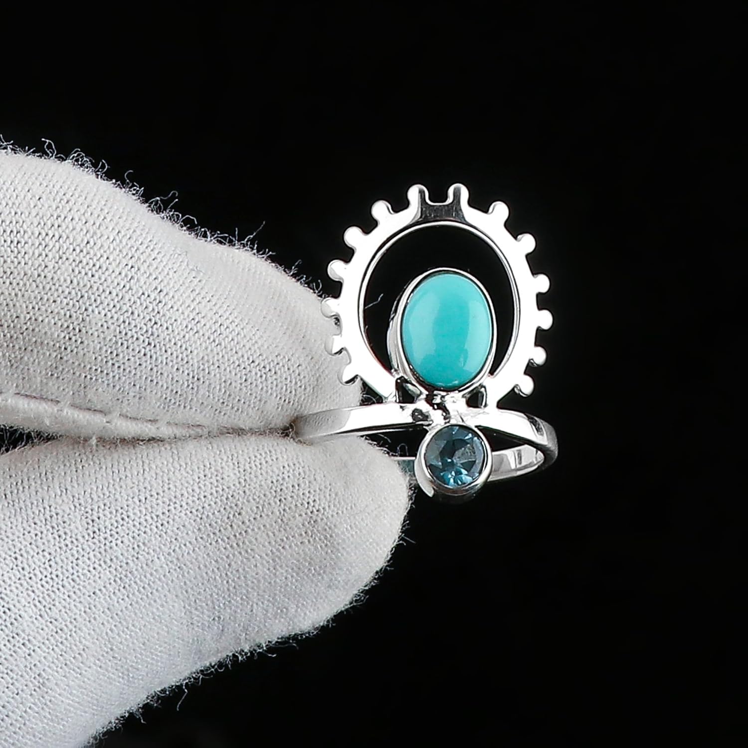 Gemstone – Turquoise & Blue Topaz | Stone Size – Approx. 7x5mm & 4mm | Stone Color – Sky-Blue | Stone Shapes & Cut – Oval Cabochon & Brilliant Round | Metal Type – Solid 925 Sterling Silver | Birthstone – December | Jewelry Type – Minimalist Ring