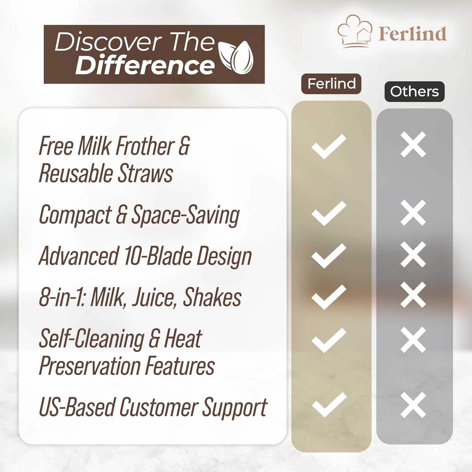 [Purhcase with Peace of mind] At Ferlind, we are committed to your satisfaction. Our exceptional customer service team is here to provide continuous support and troubleshooting. If you have any concerns about your Ferlind Nut Milk Maker, contact us for prompt solutions and replacements.