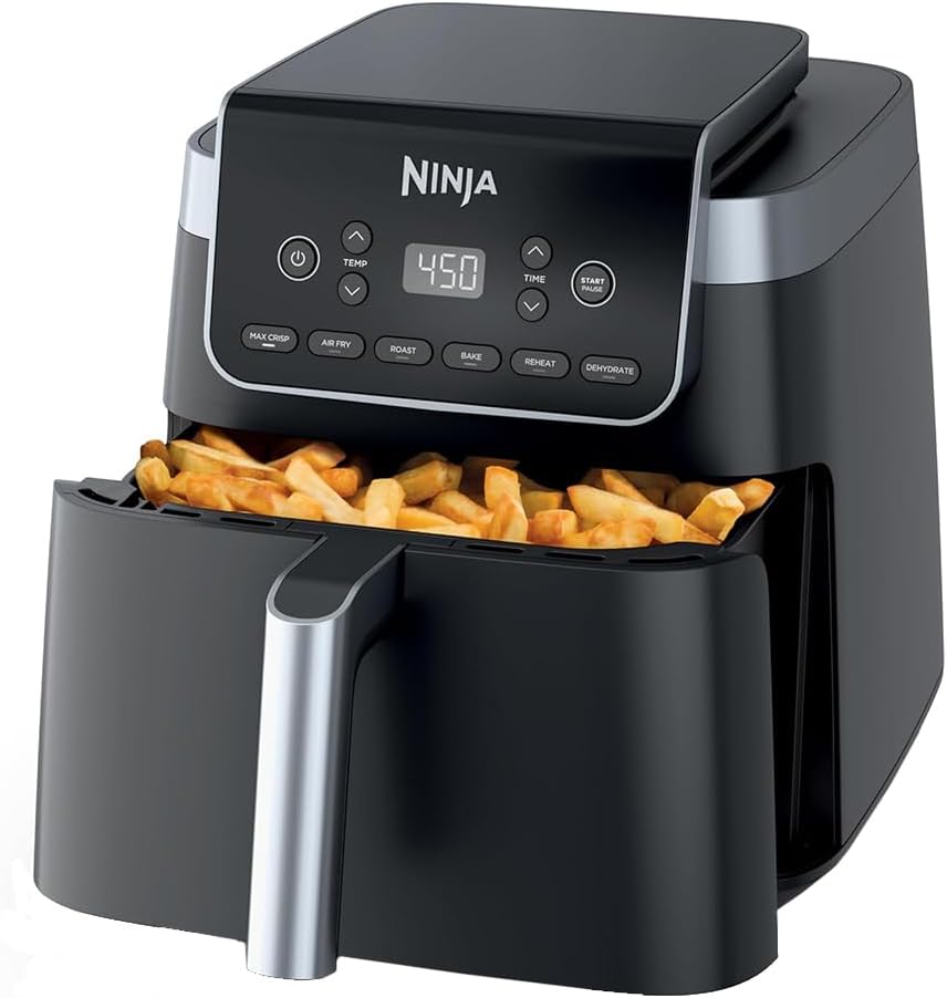 Meet the Ninja Air Fryer Pro XL, a fast and easy way to get the perfect crisp with up to 450F of heat. MaxCrisp Technology surrounds your favorite foods with superheated air for hotter, crispy results. Cook up to 9 lbs (6.5 QT) of wings using little to no oil and enjoy your favorite foods guilt-free. With 6 cooking functions, you can satisfy any craving, from crispy snacks to full meals. With Max Crisp, Air Fry, Roast, Bake, Reheat, and Dehydrate, the options are endless. Plus, cleanup is a breeze with a nonstick and dishwasher-safe crisper plate and basket.