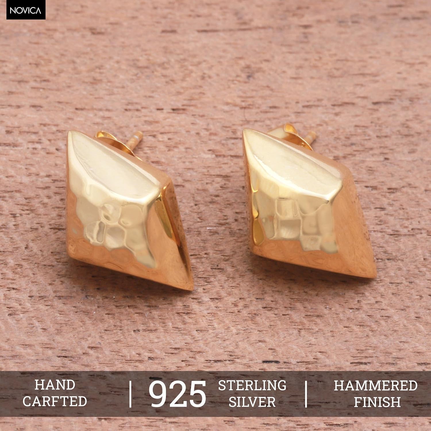 NOVICA Handmade Diamond-Shaped Gold Plated Sterling Silver Button Earrings