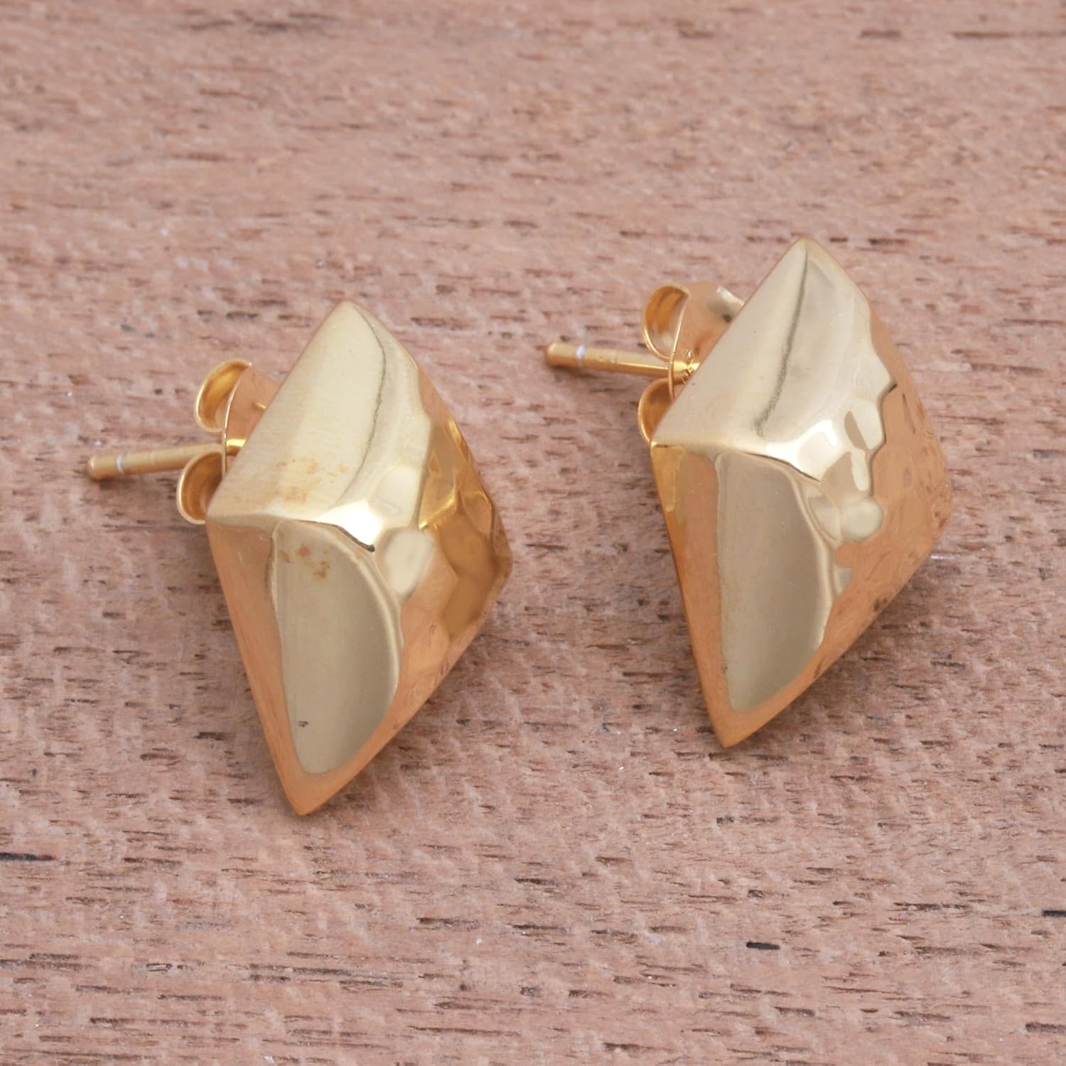 About this item: Crafted by hand from sterling silver bathed in 18k gold, two diamond shapes are decorated with a hammered finish at their centers. Balinese artisan Nyoman Ariawan creates these simple, yet stylish button earrings.