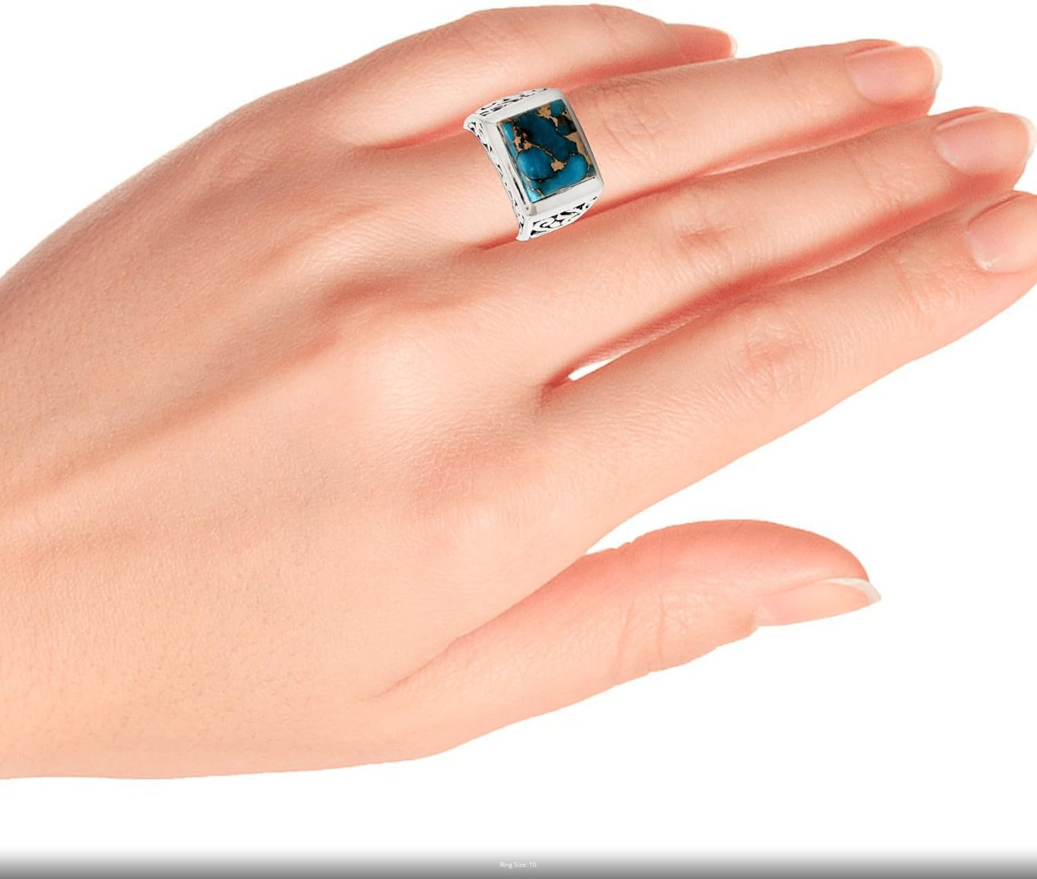 About this item: Sterling tendrils flank a blue-green gem in a distinguished ring for both men and women. From Alok Jain, this design is meticulously handcrafted of sterling silver and set with beautifully striated composite turquoise….