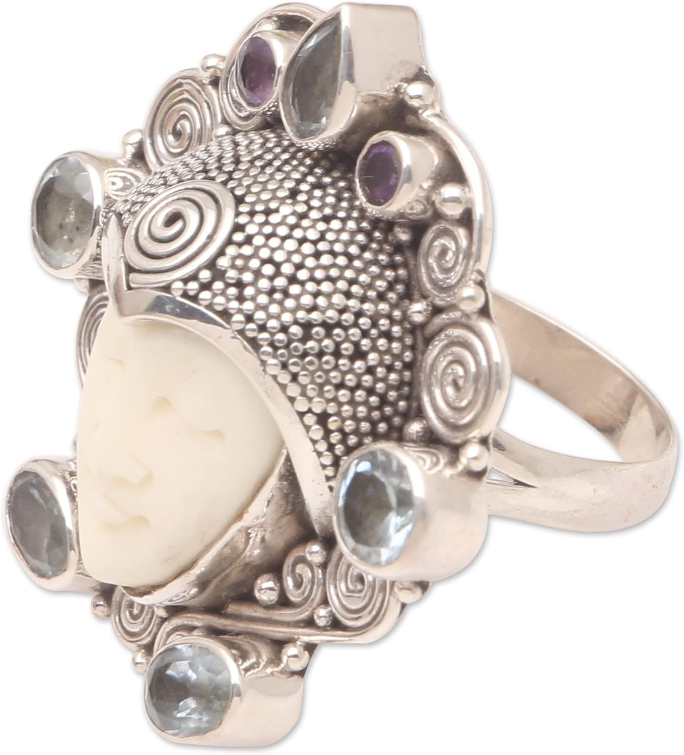 About this item: Crowned in silver and ornamented by cool gemstones, the woman on Buana’s cocktail ring looks like a queen. The Balinese artisan uses sterling silver to craft the ring, hand carving the woman from pale bone. Accented by faceted amethyst and blue topaz gems in bezel settings, the ring sparkles….
