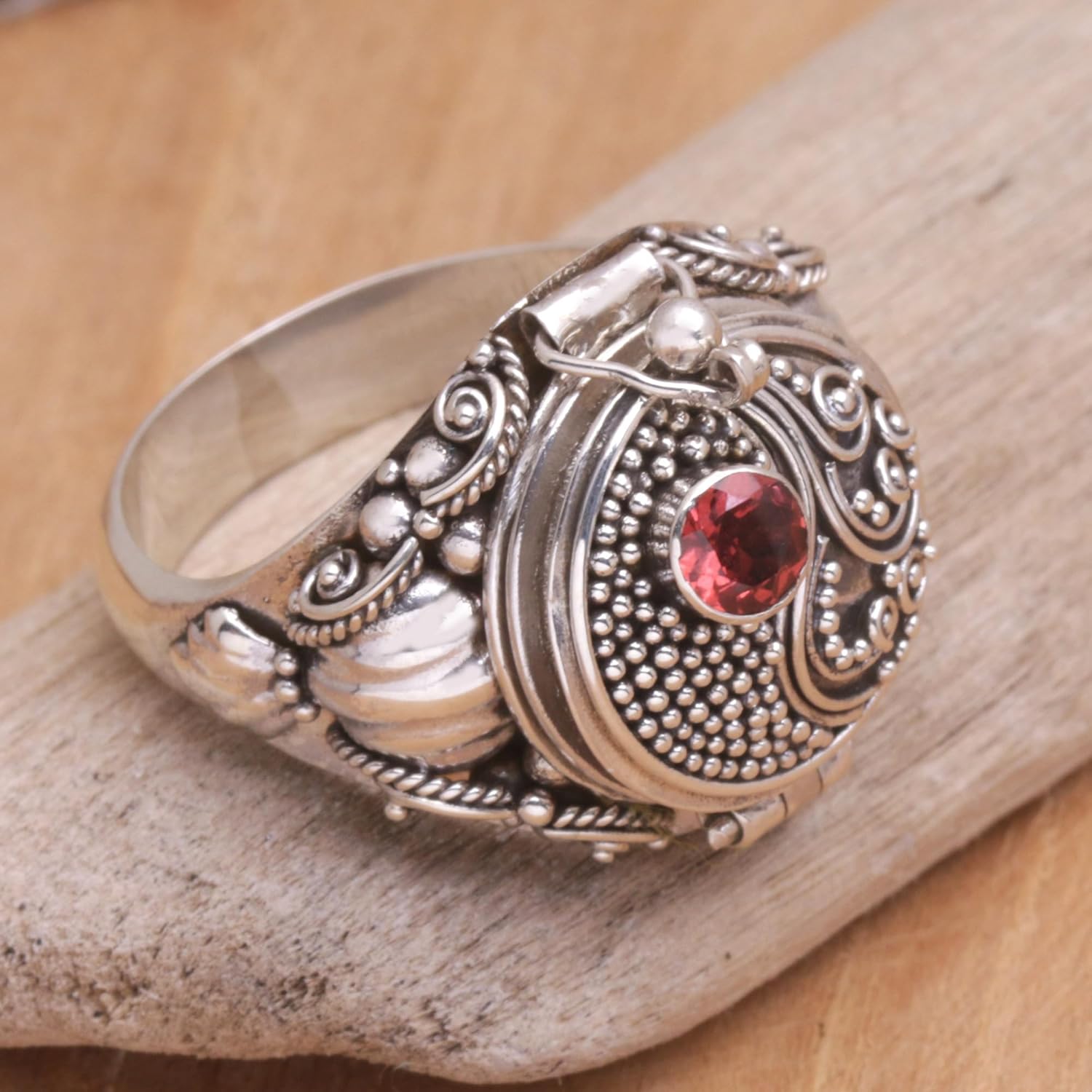 About this item: Locket rings allow carrying small photos or little items within their compartment. Presented by Bali’s Sukartini, this sterling silver accessory has charming traditional details in a swirl pattern, enhancing a faceted natural garnet stone. This gem is said to strengthen love and friendship, featuring a stunning red tone that complements several outfits.