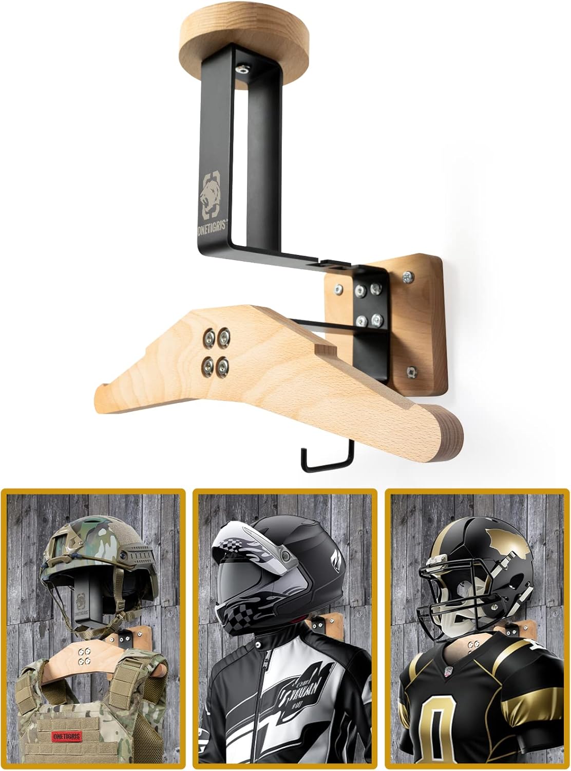 Versatile Gear Storage & Display: Our helmet holder wall mount rack provides the ultimate solution for storing a wide range of equipment, including tactical gear like helmets, vests, belts, and gloves, as well as motorcycle helmet holder rack wall mount for cycling and motorcycle. It even accommodates football, rugby, and skiing equipment, including helmets and clothing. With its adaptable design, this rack offers a versatile storage solution for all your gear needs.