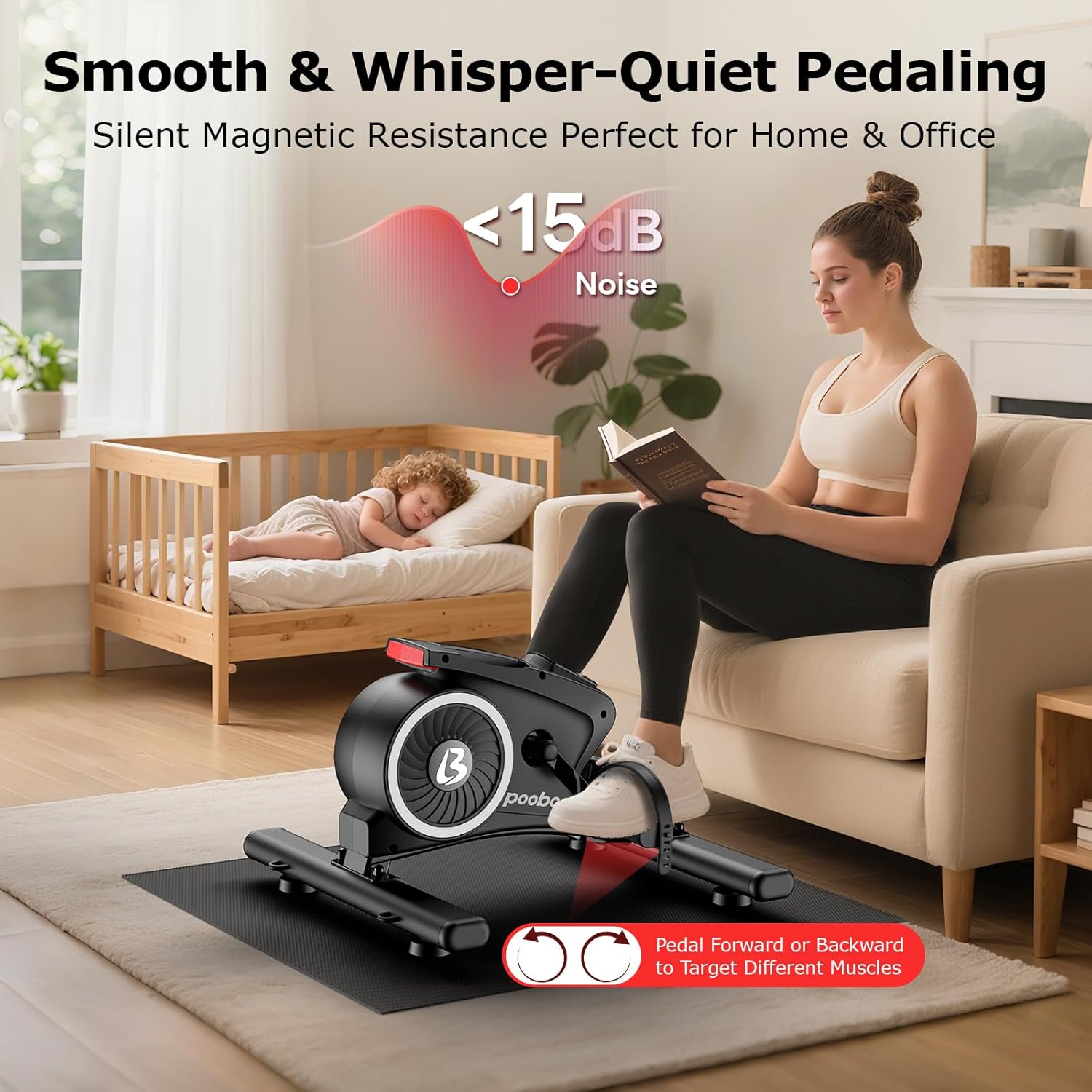Train Both Arms & Legs – Forward & Reverse Pedaling: Unlike ordinary pedal exercisers, the pooboo under desk bike allows both arm and leg workouts. Use it on the floor for lower body training, or on a desk for arms. With forward and reverse pedaling, this under desk bike engages more muscle groups for a full-body workout.