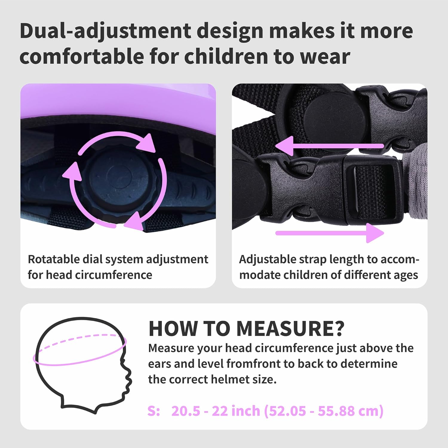【Better fitting helmets for kids】Dual-adjustment design makes it more comfortable for children to wear, rotatable dial system adjustment for head circumference, adaptable size: 20.5-22 inch(52.05-55.88 cm), adjustable strap length to accommodate children of different ages, adaptable age: 5-13 yeas