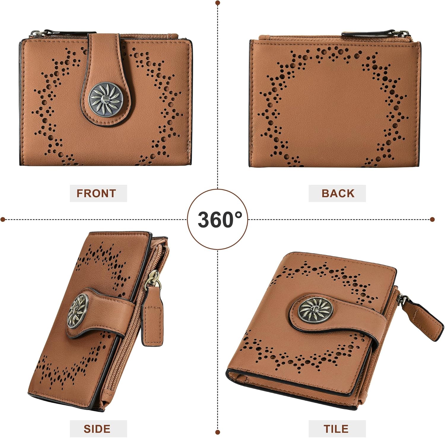 Practical Design: This womens wallet has ample space to hold cards, change, bills, and coins, keeping them well organized. It features 4 RFID BLOCKING card slots, 1 ID window, full-length bill compartments, and a side zipper coin pocket