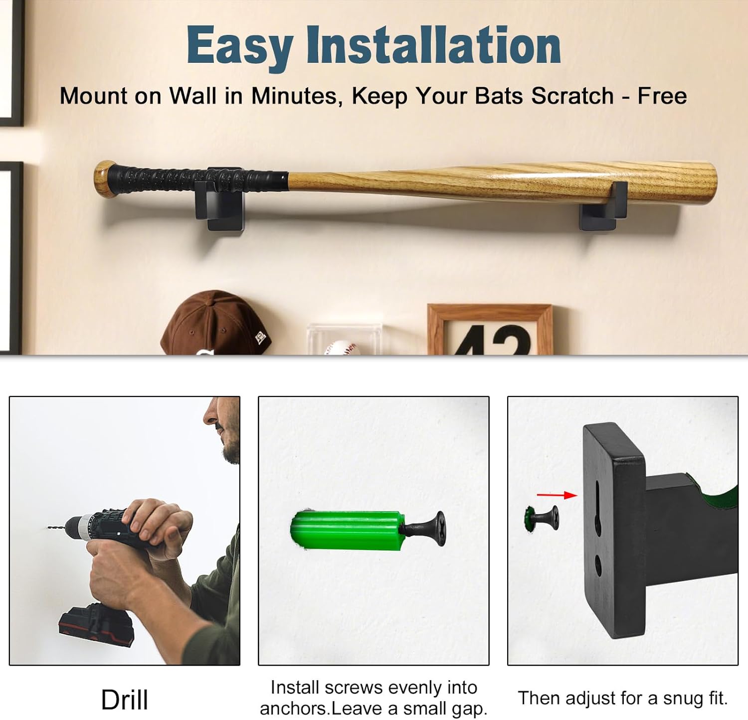 Includes 2 baseball bat hangers, 2 screws, and 2 wall anchors. Ideal for single bat displays — a great gift for athletes, collectors, and sports fans.