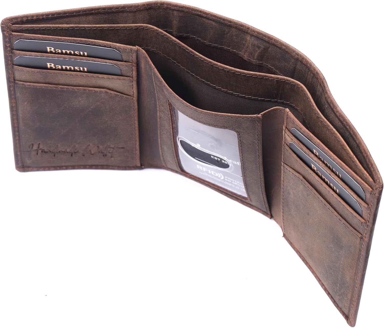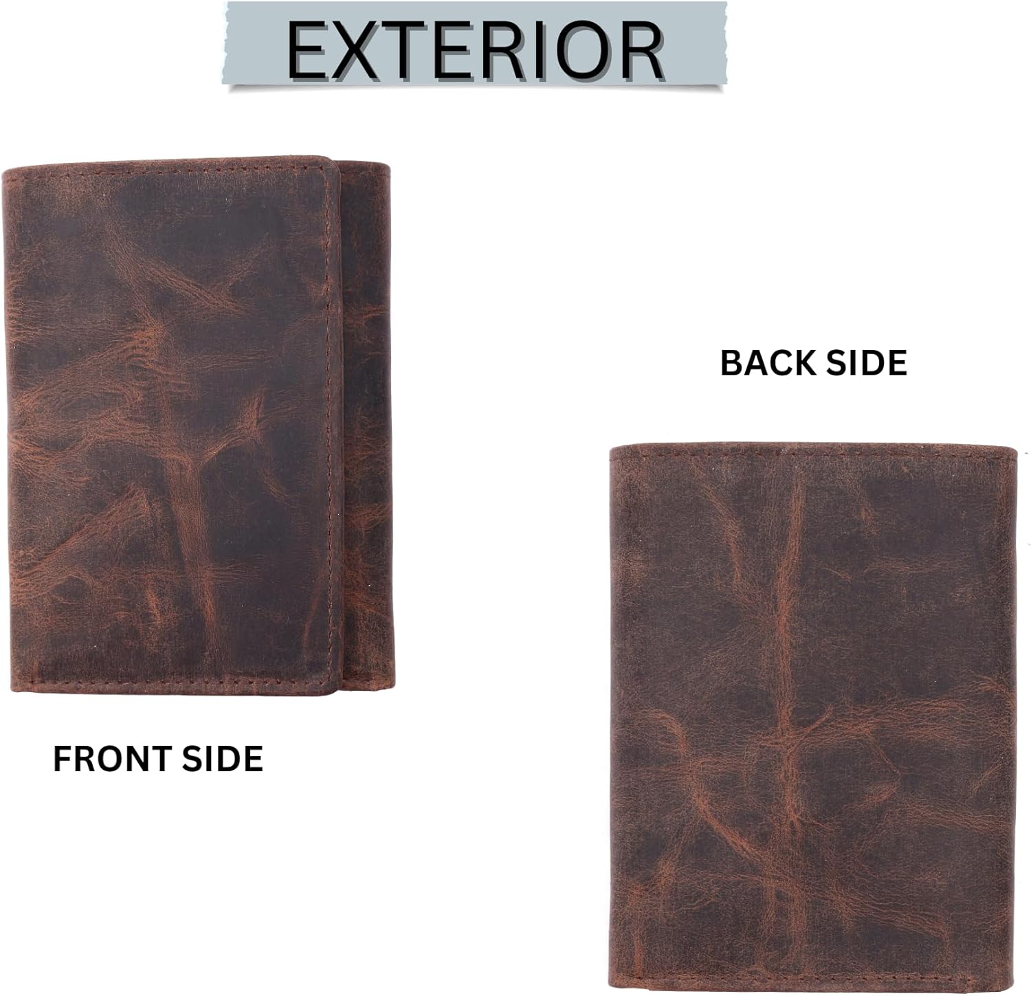 ★ Handcrafted Trifold Leather Wallet for Men – Full Grain, RFID Blocking, Gift-Ready This rugged yet refined Hunter Leather Trifold Wallet is a clear winner for those who value quality craftsmanship and timeless design. Crafted from our exclusive burnished full grain leather, this masculine men’s wallet features a clean, minimalist look with a bold, handcrafted finish. Handsome, durable, and one-of-a-kind — it slips easily into your back pocket and is perfect for everyday carry. ★ Premium Craftsmanship & Everyday Utility Sleek, simple, and made to last — each wallet is handcrafted with top grain leather, reinforced with ultra-strong stitching, and lined with RFID blocking technology to keep your cards secure. Whether for daily use or gifting, this wallet stands out. Each piece arrives in a gift-ready box, making it an ideal present for birthdays, anniversaries, and holidays. ★ Wallet Details: ● 9 Card Slots: Includes 6 card slides, 2 storage/receipt pockets, and 1 clear ID window ● 2 Full-Length Bill Compartments for cash organization ● Built-in RFID Blocking Technology to protect your personal information ● Compact Size: Measures 3.4” x 4.25” — slim enough for front or back pocket carry ● Crafted in Full Grain Leather with a hand-burnished, vintage finish