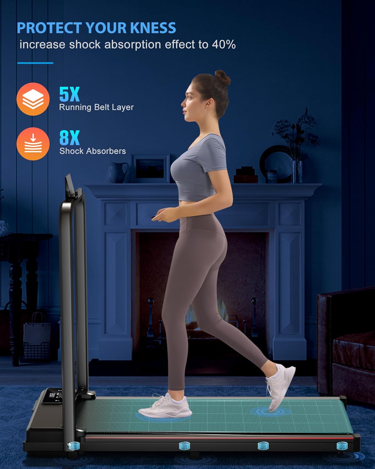 ***【Anti-Slip Runing Belt & Shock Reduction System】***Walking pad treadmill for home is designed walking mat provide a 14.95″*35.43″ compact running area with a 6-layer anti-slip belt, 10 silicone shock absorbers and 2 shock absorb cushions, it helps to shock absorbing and noise reducing, making your running quieter and more stable, it reduces the impact on your body, ensuring knees, muscles and joints protection during running