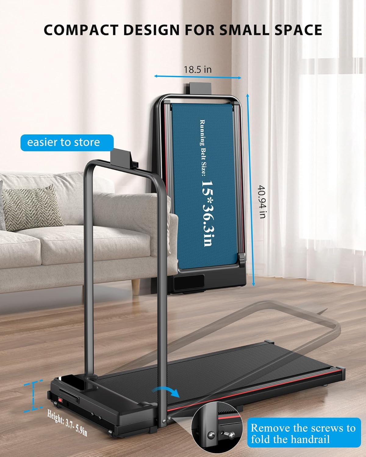 ***【Safety Walking Pad with Handle bar for Small Spaces】*** Friendly & Safe Handrail (no button) for Beginners or Older Adults*** Just use a wrench to unscrew the screws, and the handle can be folded down. In addition, Built-in front transport wheels make the walking pad portable, and its compact design makes it easy to store in a small space at home or in the office. The 4.53” height makes it easy to place under a sofa or bed to save space