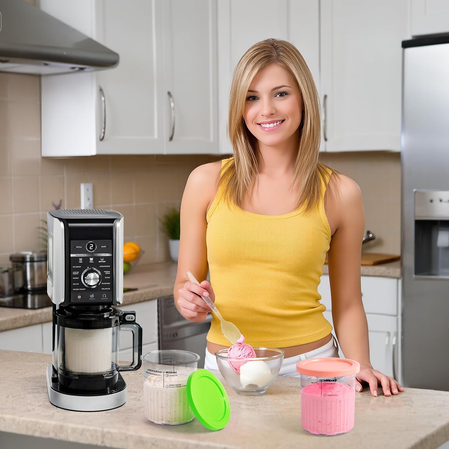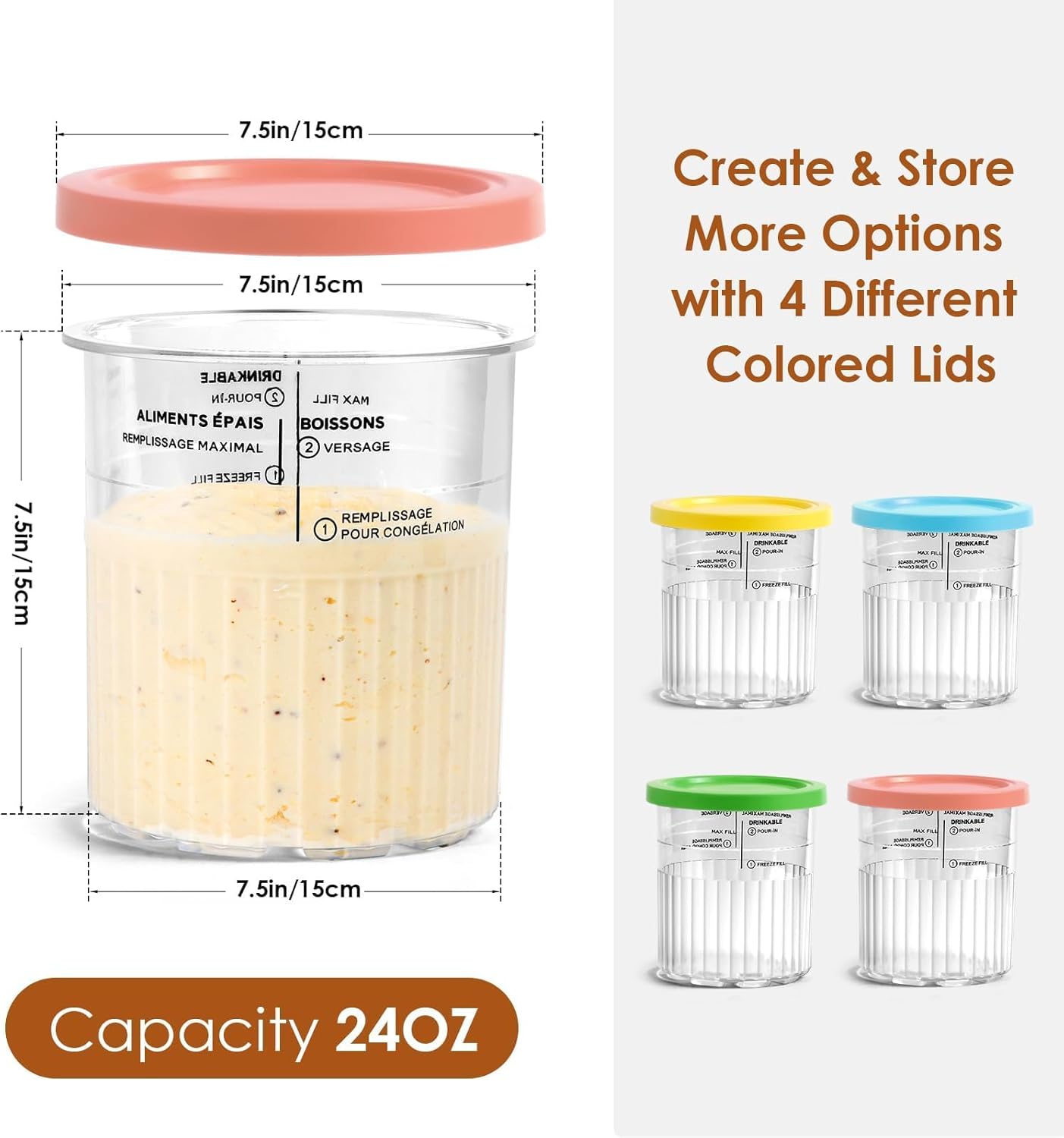 【4-Pack 24 OZ BPA-Free Durable Containers】The ninja creami deluxe containers kit includes 4 transparent 24 OZ pint containers (family-size capacity) and 4 colored lids (for easy flavor identification). Made of food-grade, BPA-free, shatterproof material—withstands -22°F to 302°F (-30°C to 150°C). Sturdy, reusable, and built for long-term, frequent use.