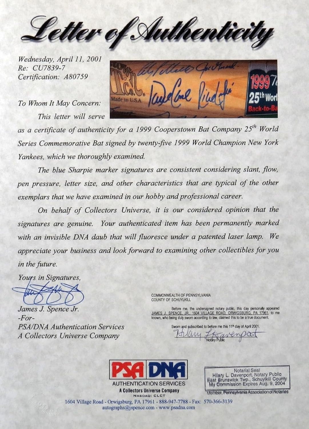 Beautiful 1999 NY Yankees World Series Champs Team Signed Bat Derek Jeter PSA . If a product is unsigned or non game-used, a hologram will not be included. Derek Jeter memorabilia. New York Yankees memorabilia.