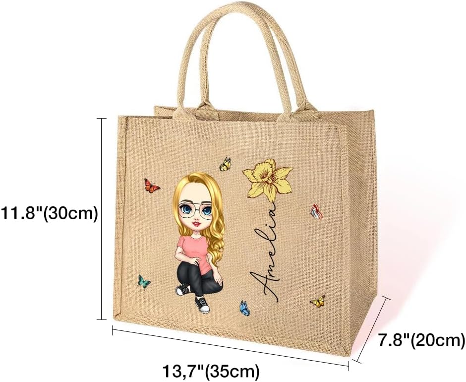 Celebrate the unique personality and style of the women in your life with our Personalized Cute Cartoon Jute Tote Bag. This bag is more than just a carrier; it’s a fashionable statement that complements any outfit and occasion.