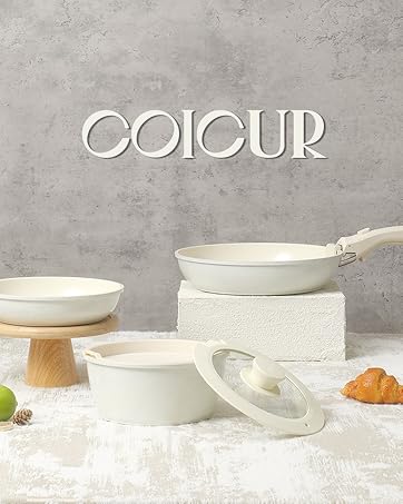 Non Stick Ceramic Coating- With premium PFAS/PTFE/PFOA free ceramic coating, our non stick cookware set requires less oil for cooking and protects food from burning with effortlessly release. Have healthier diet and fresh tasty dishes with COICUR pots and pans set