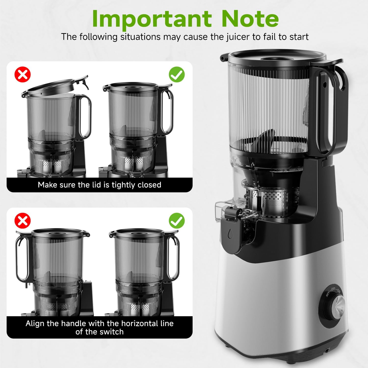 【 Troubleshooting Guide】To ensure the proper operation of the juicer, please follow these troubleshooting steps: 1.When installing the juicer, ensure that the handle is precisely aligned with the start button. 2.Ensure that the lid is tightly closed.After completing the above – mentioned checks, if the problem persists, please contact us for a solution!