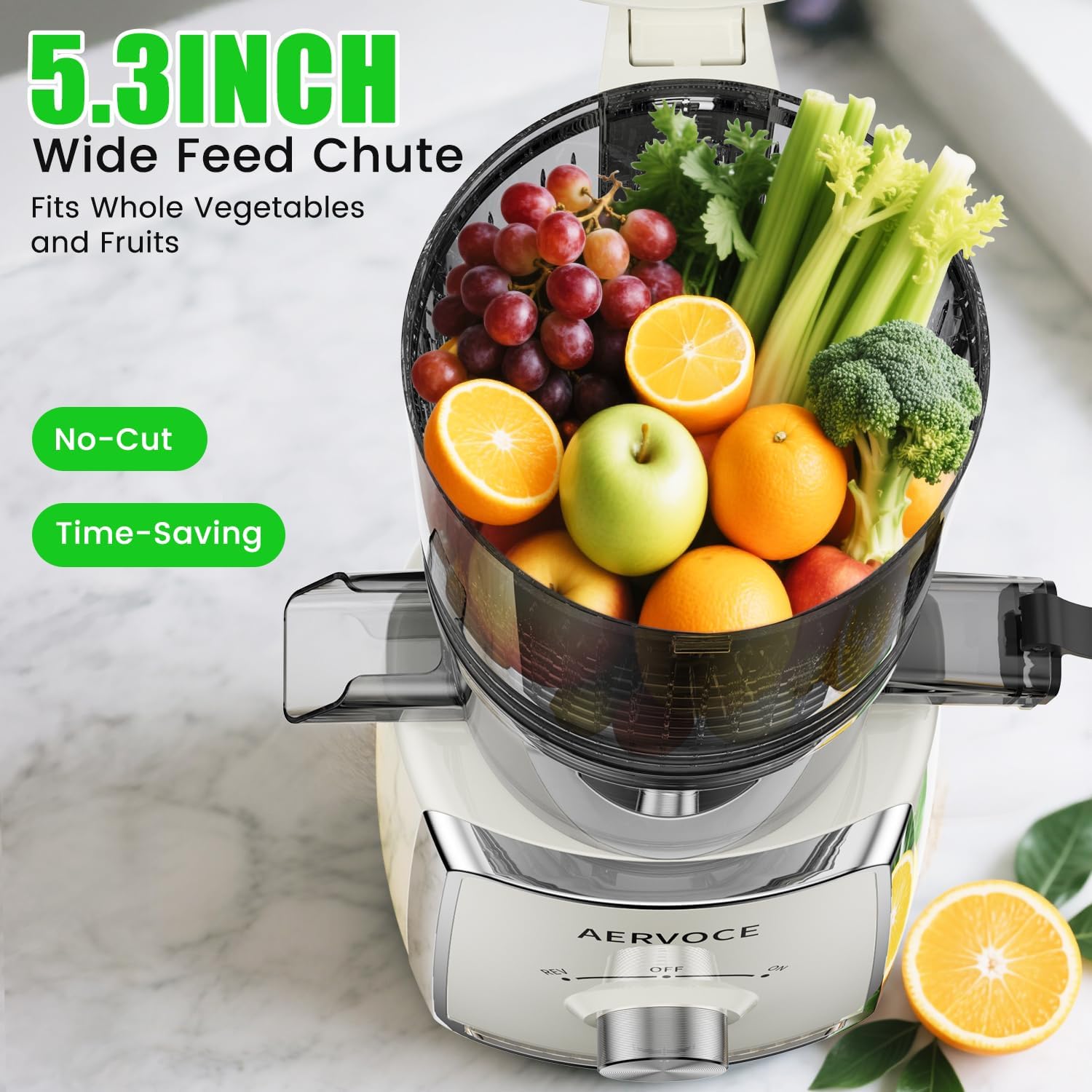 【5.3inch Large Feed Chute】The cold juicer machine is equipped with a large 5.3-inch feed chute that you can juice whole fruits and vegetables without chopping.There’s no need to pre-cut into small pieces, saving you time.