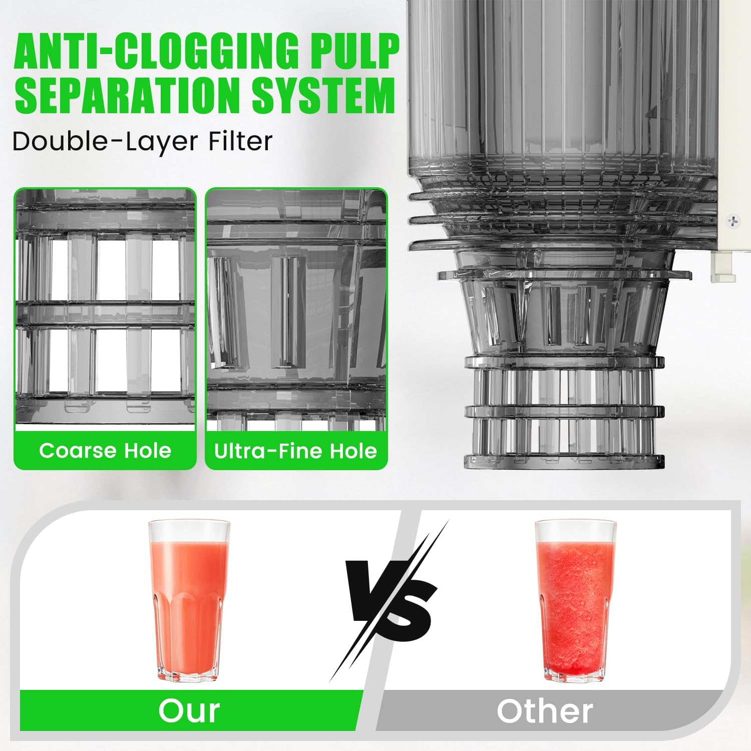 【Anti-Clogging Pulp Separation System】Featuring a double-layer filter skeleton design, the masticating slow juicer precisely separates pulp from juice, ensuring a smooth and delicate drinking experience and delivering a near-perfect juicing experience.