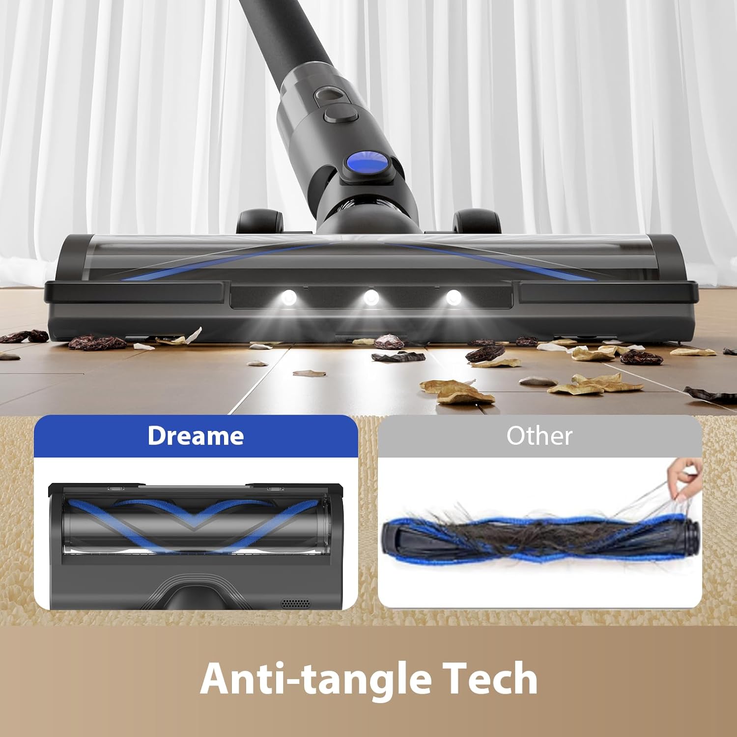 Efficient Cleaning: 450W motor drives 144AW suction — well-suited for deep household cleaning — paired with an all-terrain dust brush that handles settled dust in floor gaps, pet hair, and fine particles. The brush adjusts to multiple surfaces such as carpets and hardwood floors in one machine.