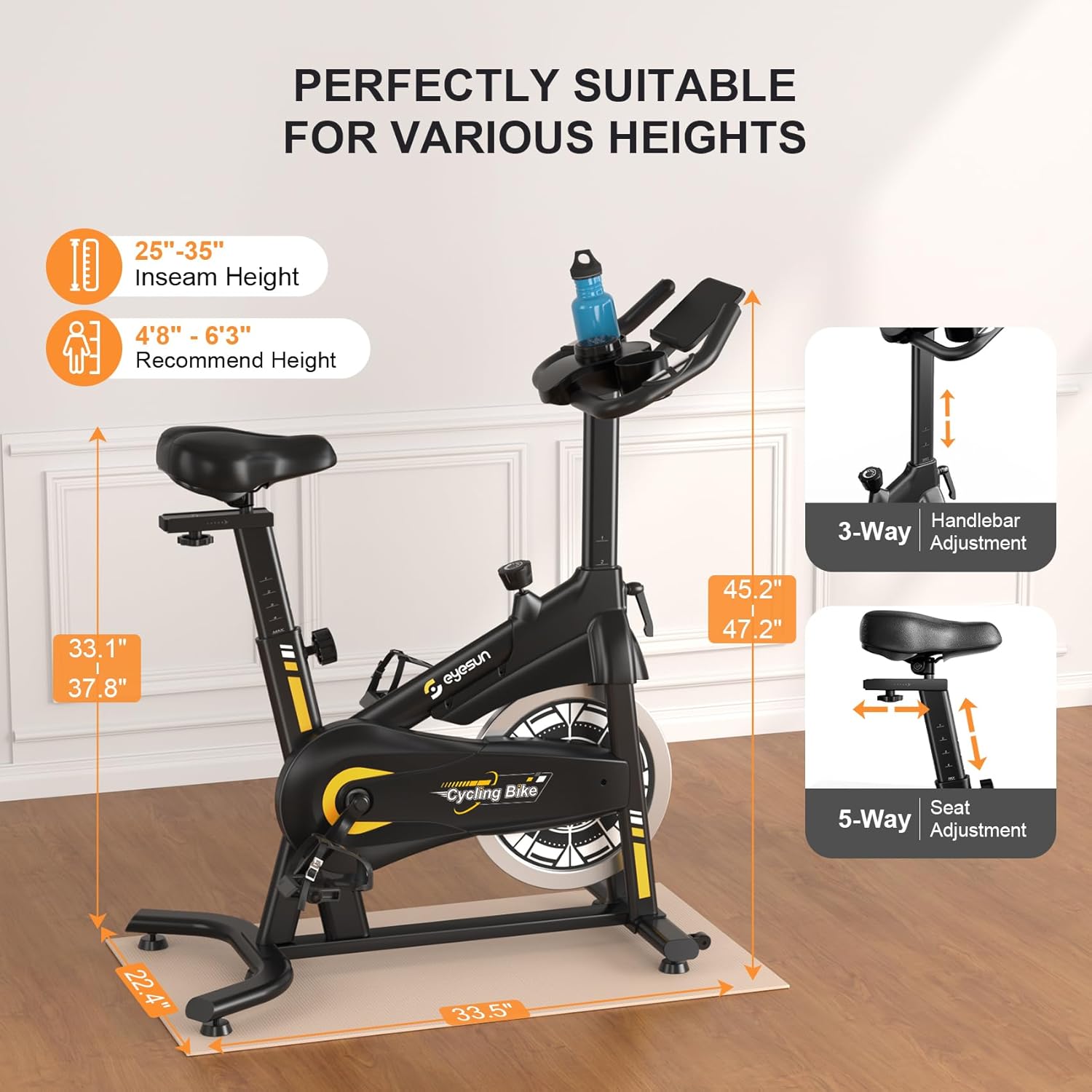 Safe & Convenient to Use: Built for stability and safety even during intense workouts, the EYESUN exercise bikes for home supports up to 300 lbs. The resistance bar lets you stop the flywheel instantly for added safety, while the convenient adjustable knob allows you to customize resistance levels to suit your training goals. Thoughtful features like a monitor holder for your tablet or phone, a water bottle holder, and built-in transport wheels make your workout experience smooth and hassle-free.